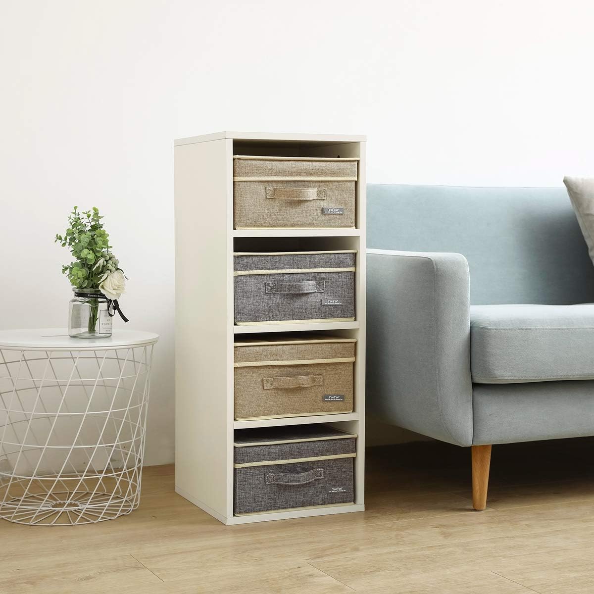 YueYue 4 Pack Small Fabric Storage Box with Lids, Foldable Linen Storage Box with Lids 4 Pieces Gray&Linen Set 12.4in/12in/6.7in
