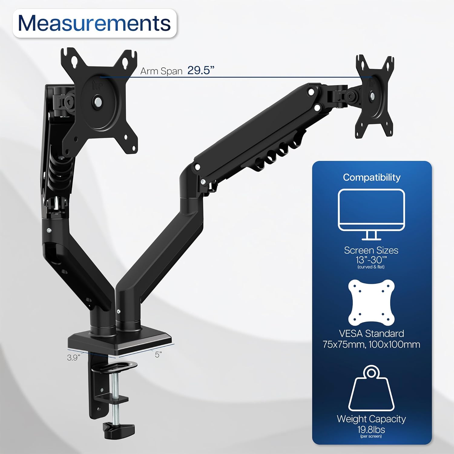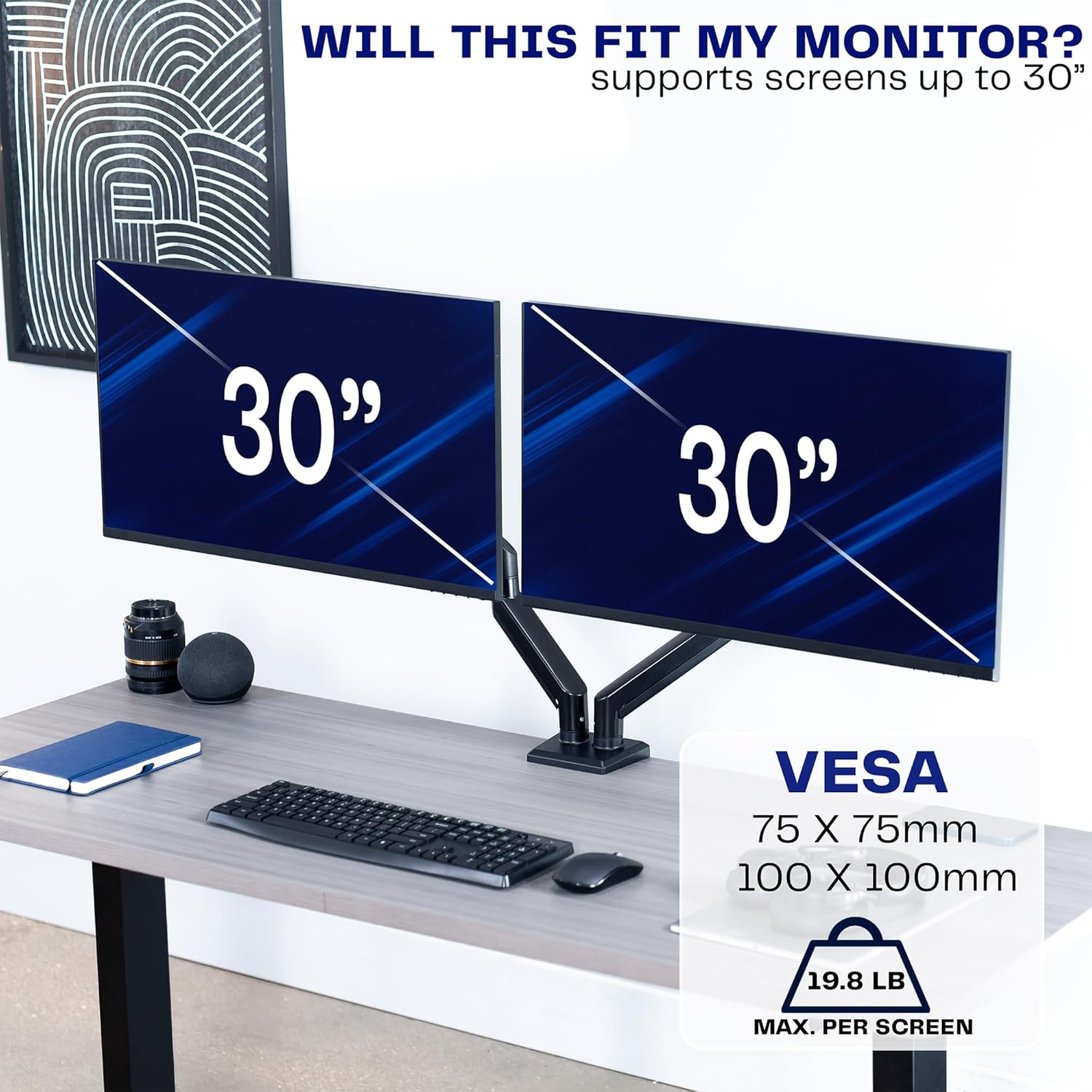 - Fits Standard Size Screens: Dual mount for monitors 13” to 30” in size and up to 19.8 lbs in weight (each) with 75x75mm or 100x100mm VESA patterns. Secures to desks up to 2.4" thick with heavy-duty C-clamp or optional grommet mount