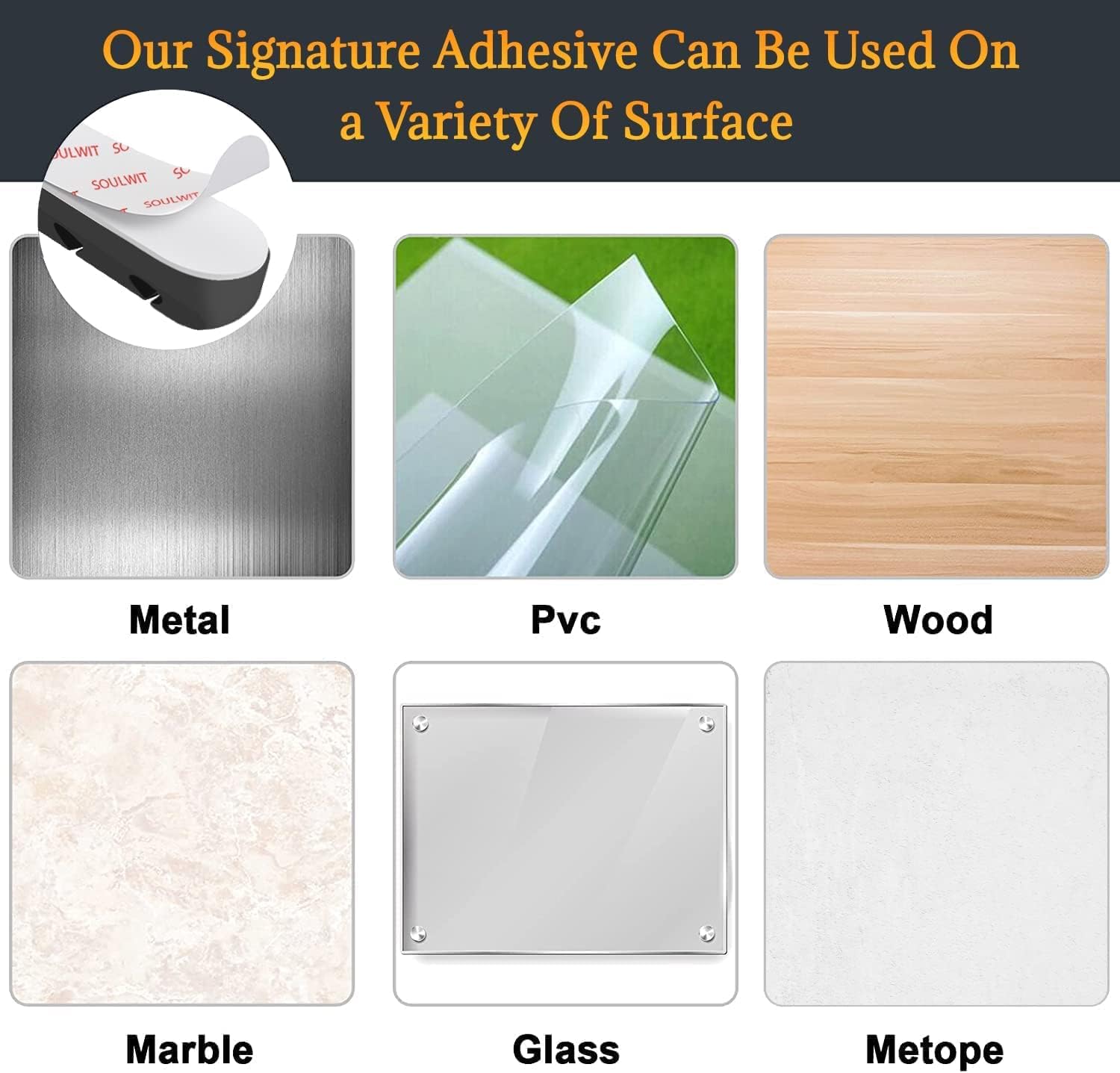 - 🔷The double-faced adhesive is very firm and long-lasting and works well in smooth and clean the surface, such as marble, plastic, wood, glass, metal, and rubber.