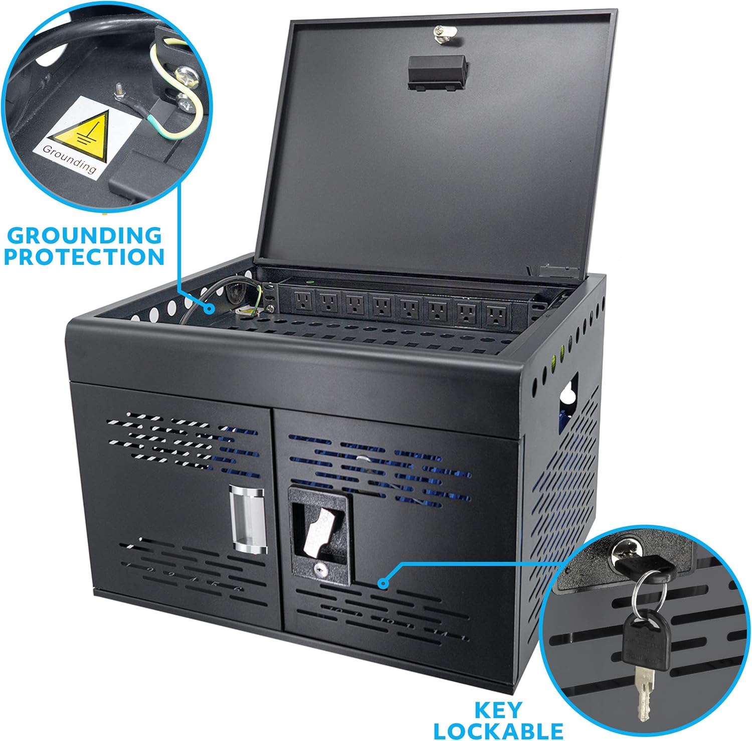 - LAPTOP & TABLET LOCK BOX: The front door and top door of theis locking laptop charging station are equipped with a sturdy key lock (each door comes with 2 keys), dual protection to keep your devices safe and prevents unauthorized access. Provided two 8-outlet 120V/15A horizontal power strip with ground protection, stored above the cabinet to ensure safety for teachers and students.