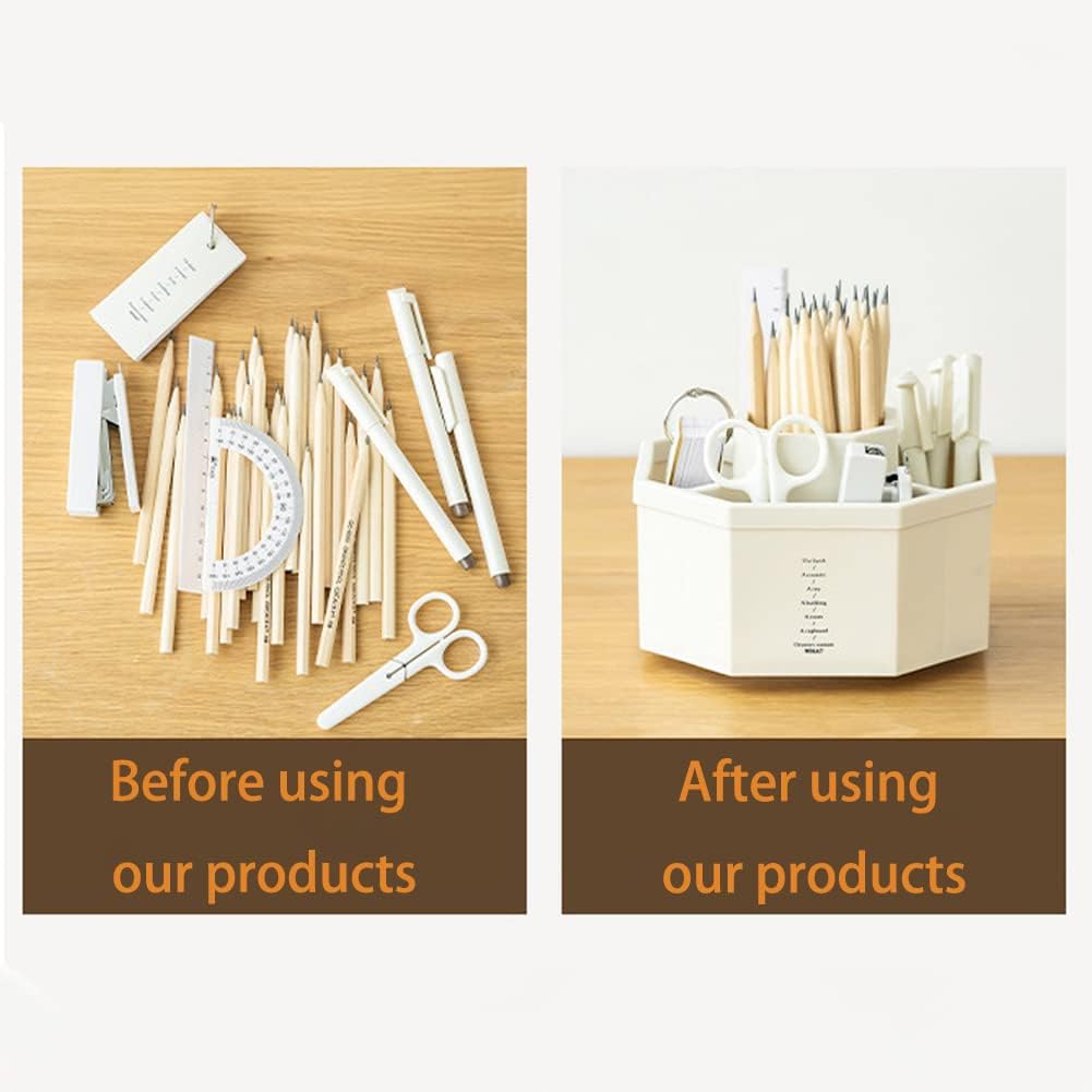 - ✎360 Degree Revolving Design: Simply spin this pencil holder to store or take out your things, this storage organizer allows you to keep all of your things within reach. Our office plastic desk organizer with divided 5 compartments that will organize pens, pencils, , ruler, clips, scissors and other office accessories separately