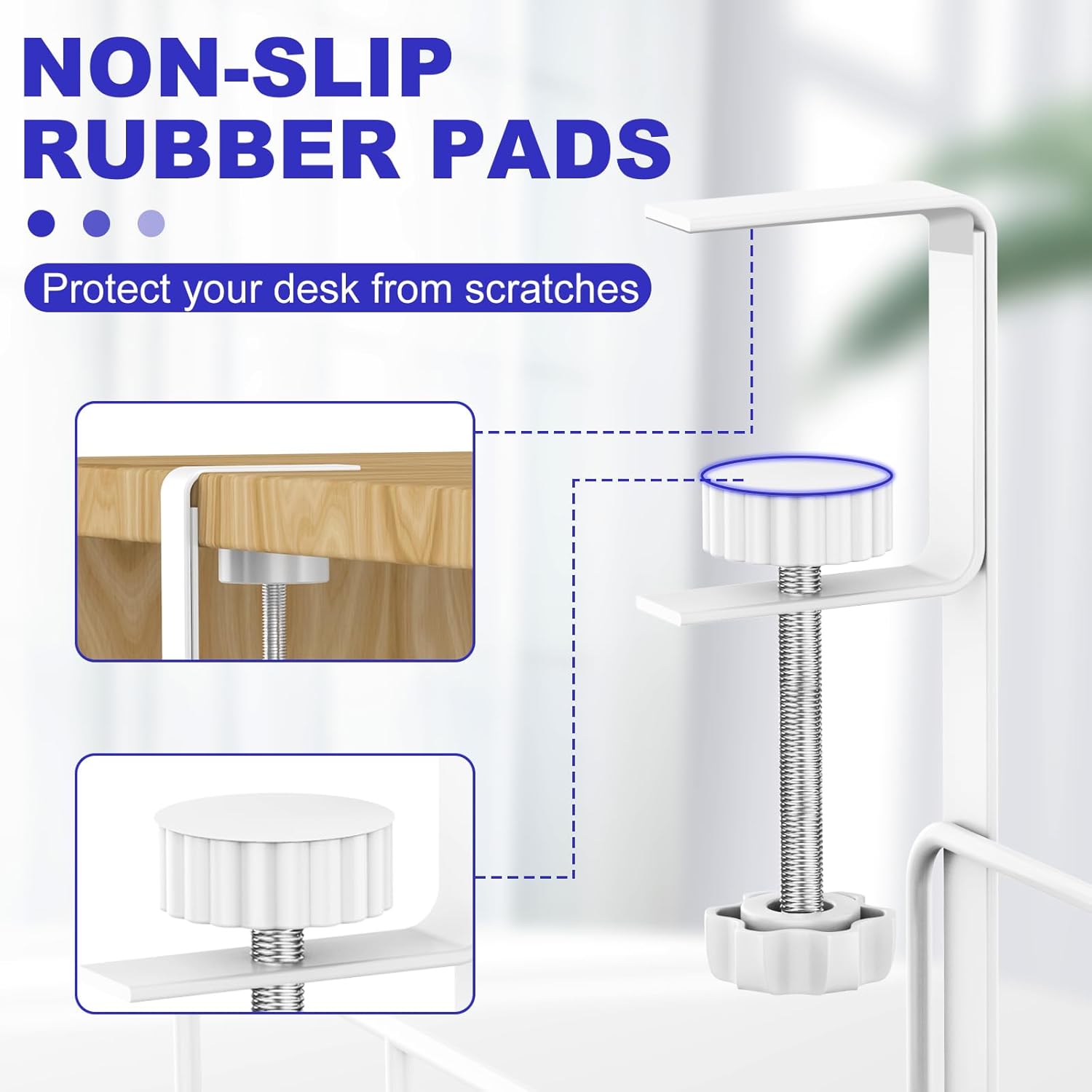- CONSIDERATE SILICONE DESIGN : Soft rubber pads on adjustable and removable clamps protect your desk or table from scratches.