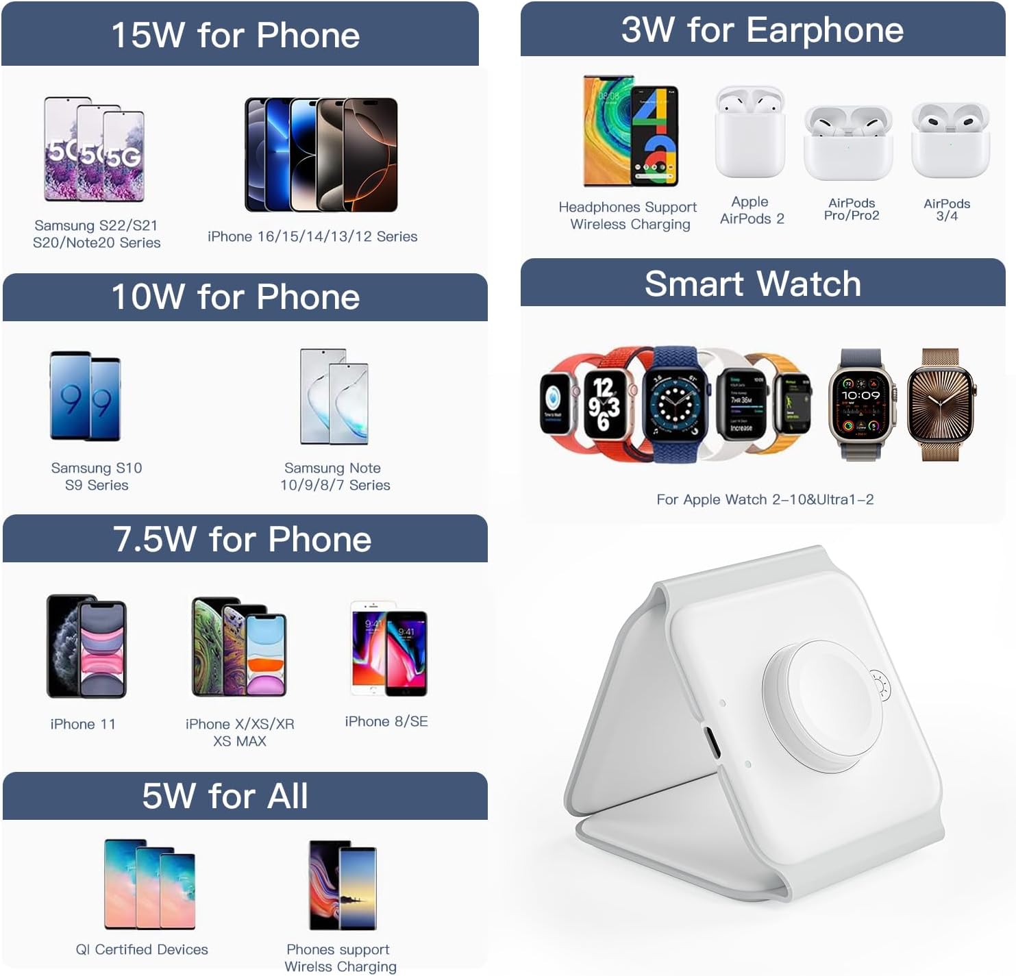 - Compatible Devices : Airpods 2/3/4/Pro/Pro 2(Supported QI), iPhone 8/x/11/12/13/14/15/16 series, iWatch 2/3/4/5/6/7/8/9/Ultra/SE Airpods 2/3/4/Pro/Pro 2(Supported QI), iPhone 8/x/11/12/13/14/15/16 series, iWatch 2/3/4/5/6/7/8/9/Ultra/SE