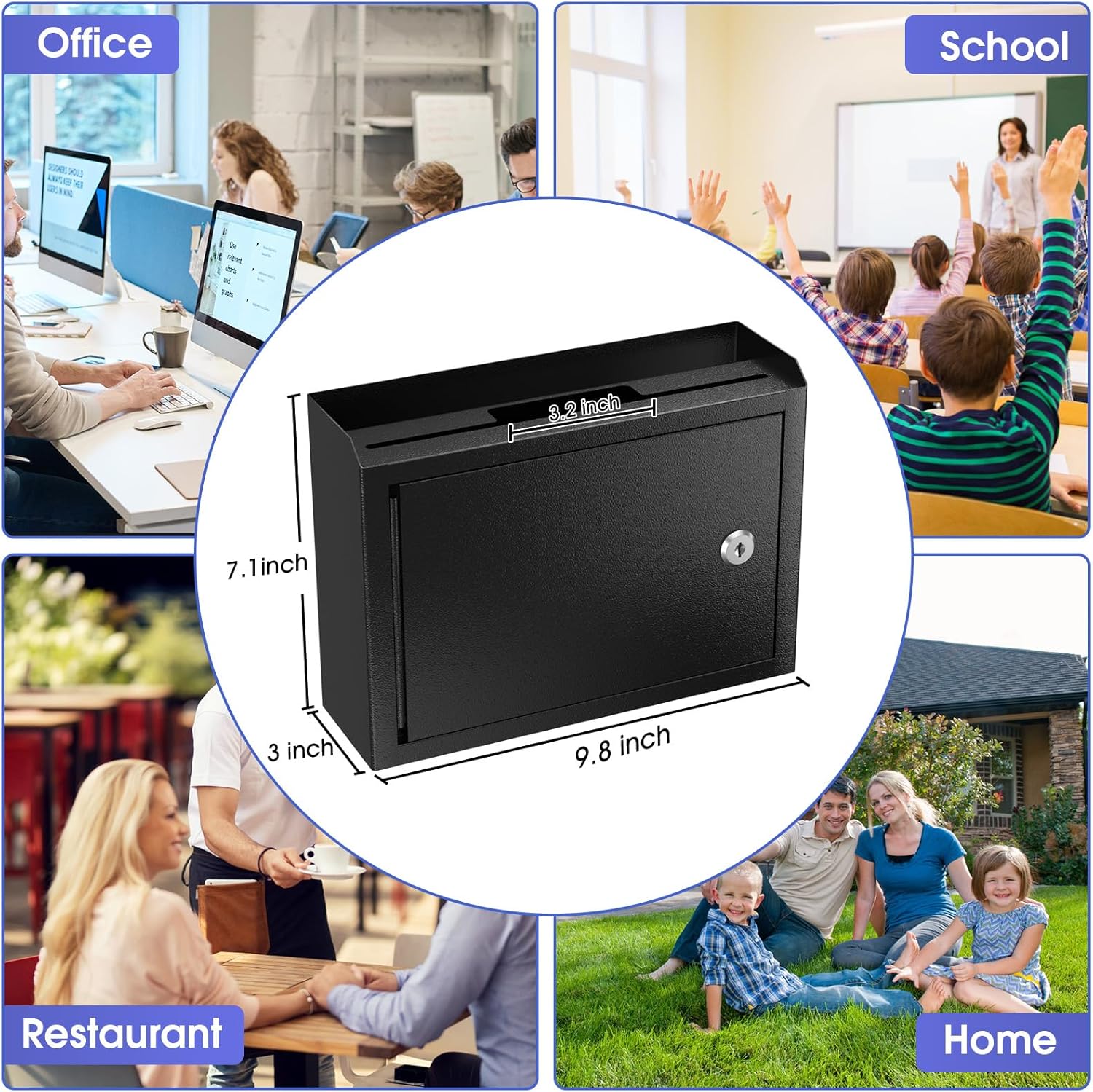 - LOCKING BOX WITH SLOT: The top of the box has one narrow slot which measures 3.2 inch, suitable for suggestion cards,votings and another wide slot measures 9 inch, suitable for files or mails. The storage on the top is convenient for you to storage blank suggestion cards
