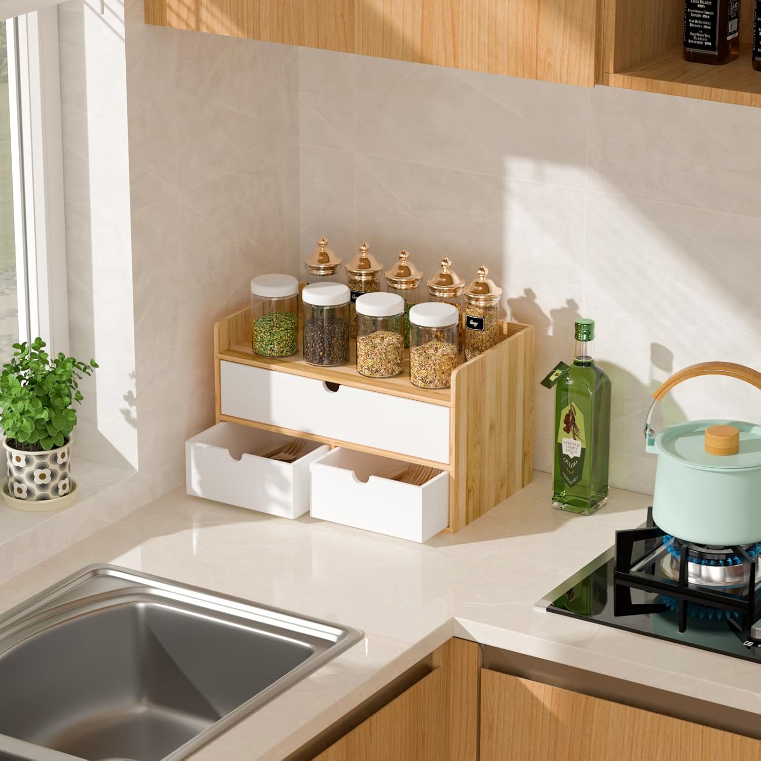 Wisuce Desk Organizer with Drawers - Bamboo Desktop Organizer Storage | Natural-White Wood Desk Drawers Organizer for Bills, Office Supplies, Cosmetics, Seals No Assembly Required