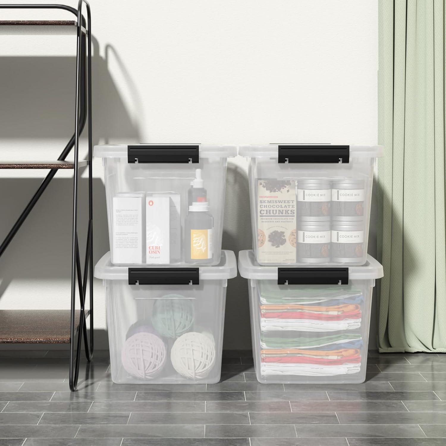 - Set of 4 clear storage bins with handle