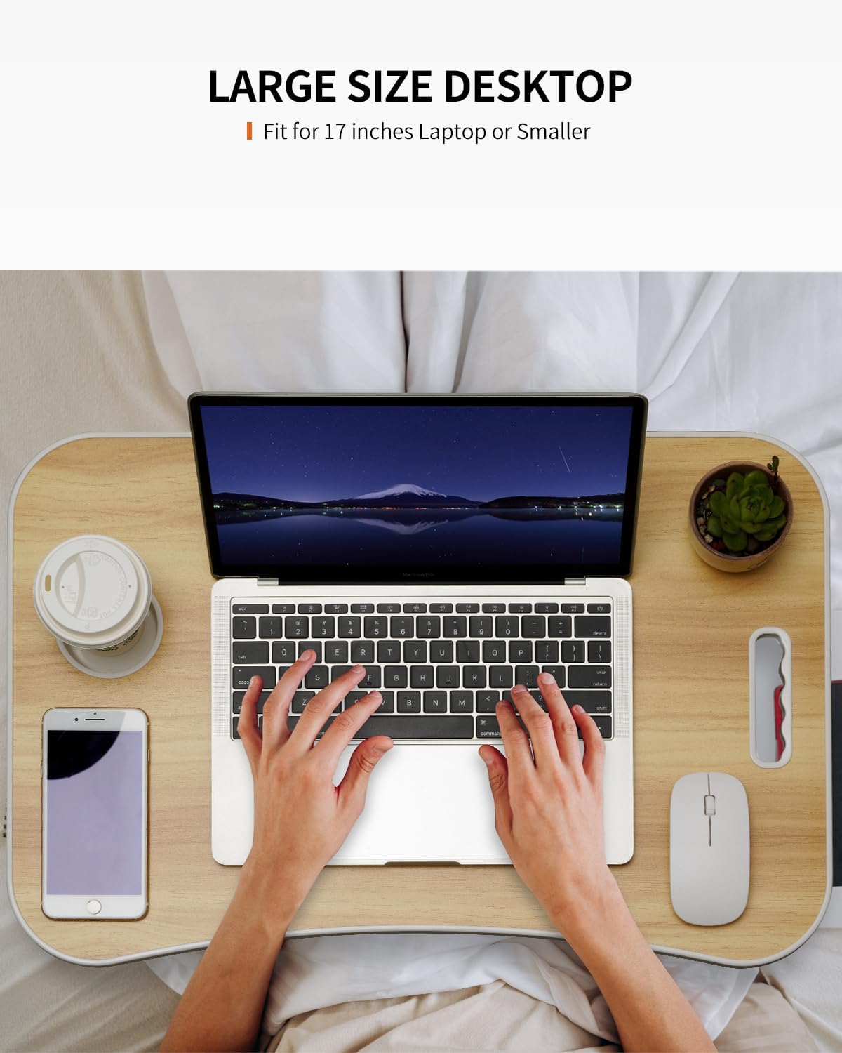 - Large Size Desktop: The dimensions (LxWxH) of this table when opened are: 23.5x15.7x10 inches. The tabletop can accommodate a large-sized laptop, a mouse, notebooks, tablet, cup, cellphone, and other items. The leg space is also spacious enough, making it suitable for people of various body sizes and age groups to use.