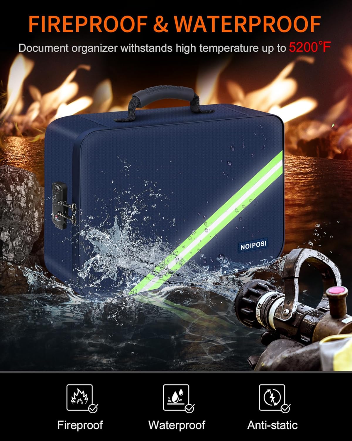 Noiposi Important Document Organizer, Waterproof and Fireproof Document Box with 7 Pockets File Folder,Portable Home Fire Safe Storage Box Case with Lock for Documents,File and Card,Blue