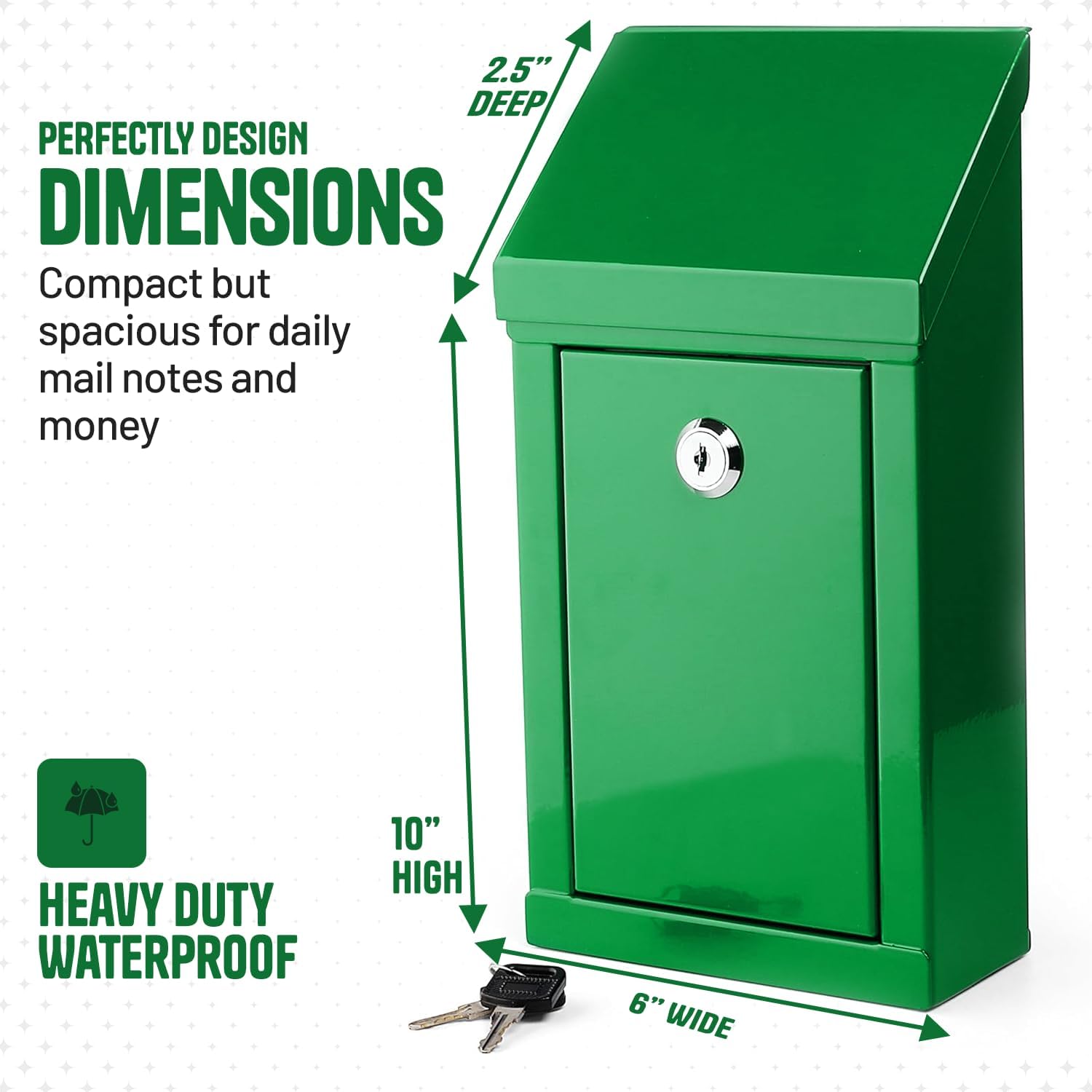 Metal Donation Box-Suggestion Box with Slot and lock-Cash Lock box for Money-Waterproof Drop Box-Comment and ballot voting box-comes with pre-drilled holes for easy wall mounting 10 X 6 X 2.5"(Green)