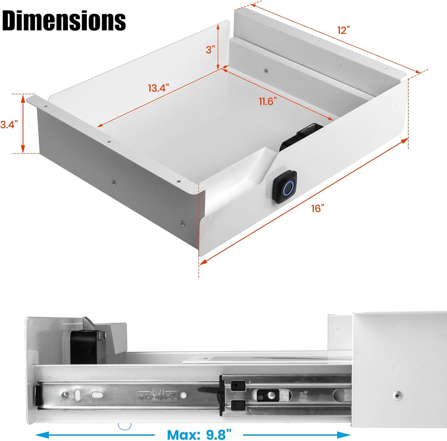 Under Desk Drawer with Lock, 16 inch Under Desk Storage Drawer, Under Desk Mounted Pull Out Drawer with Biometric Lock