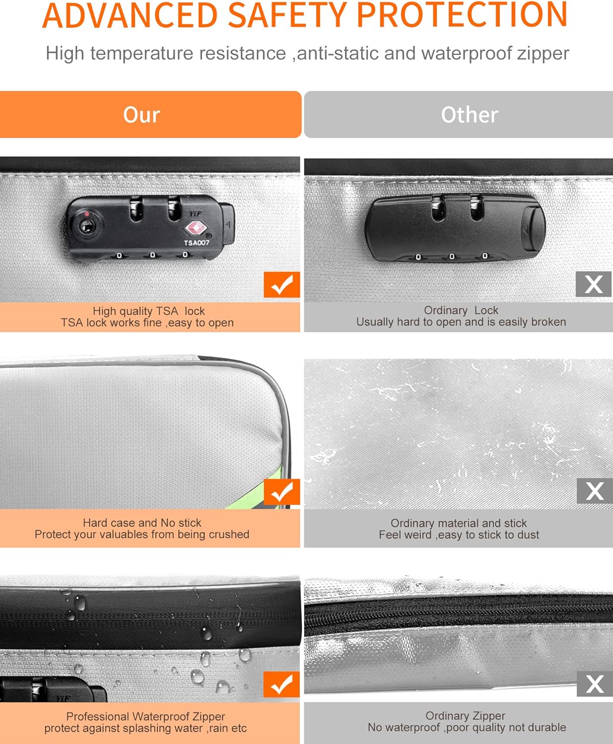 - New Non-stick Material and Water Resistant Zipper: through the unremitting efforts of technicians, now they have developed a non-sticky anti-static material for lock box for documents .We don’t worry that the cat’s hair and dust or dirt particles would immediately stick to it.Meantime, the Sealed zippers of important document storage are totally water resistant which can survive the spray of firefighter's hose on full blast, provides security seal and maximum protection for our documents