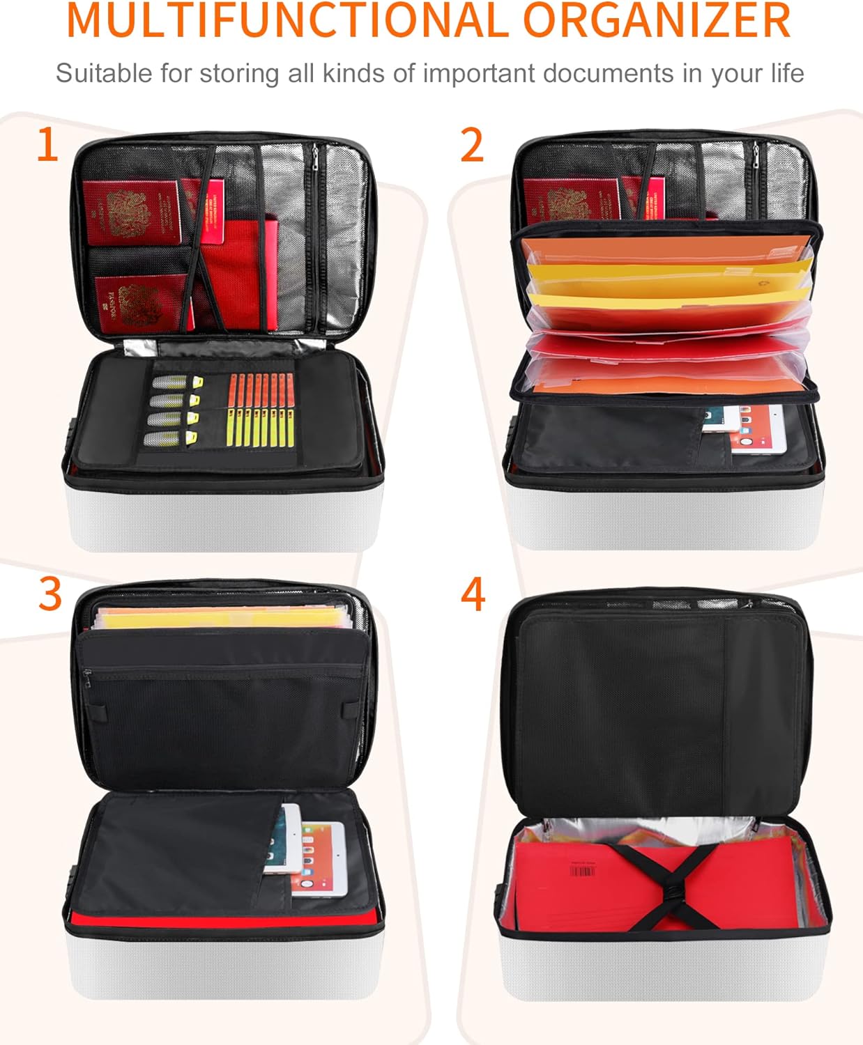 - Keep Documents Organized and Safe :important document organizer is very nice - easy to use. The smaller slots and compartments are perfect for passports, social security cards, birth certificates etc. The larger slots are nice for wills and miscellaneous documents, while the large compartment is nice for folder or other larger items.7 pockets file folder inside fireproof document bag could help us assort important documents so that we can quickly find them when we need