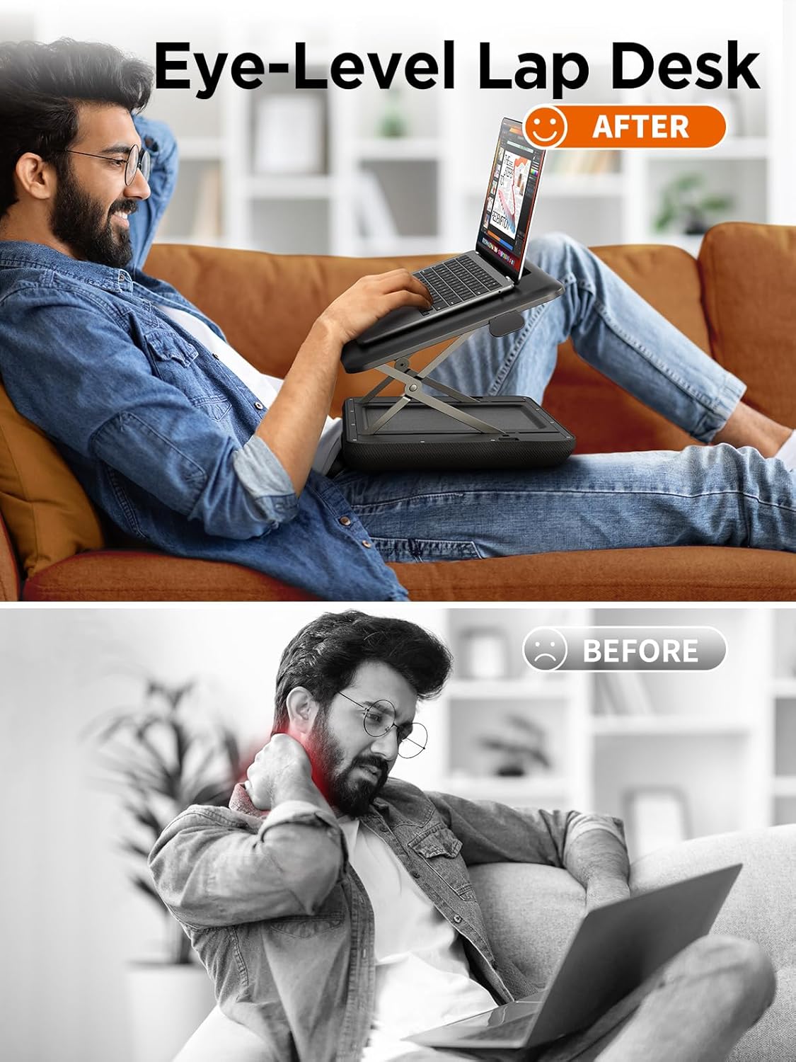 - Comfortable Lap Desk with Cushion: The laptop bed tray's microbead pillow cushion is soft, comfortably conforms to your lap, helps keeps the lap desk surface stable while in use, and steadies your work in home office.