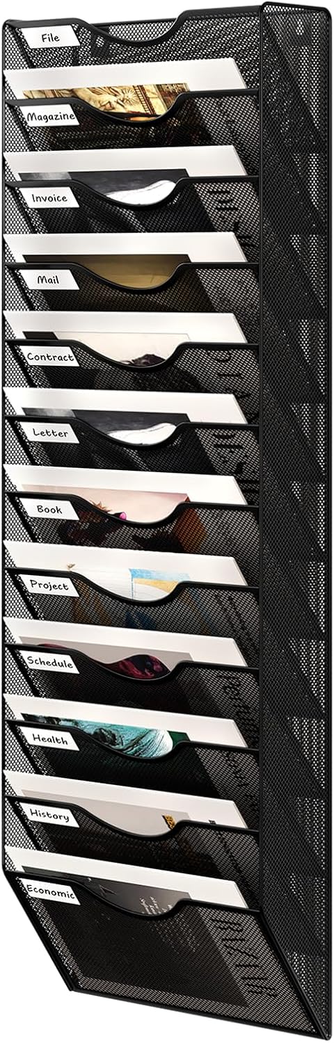 12 Tier Hanging Wall File Holder, Metal A4 Wall Mounted Document Holder, Vertical Hanging Mail Organizer, Magazine Storage Rack for Office Home Classroom, Black