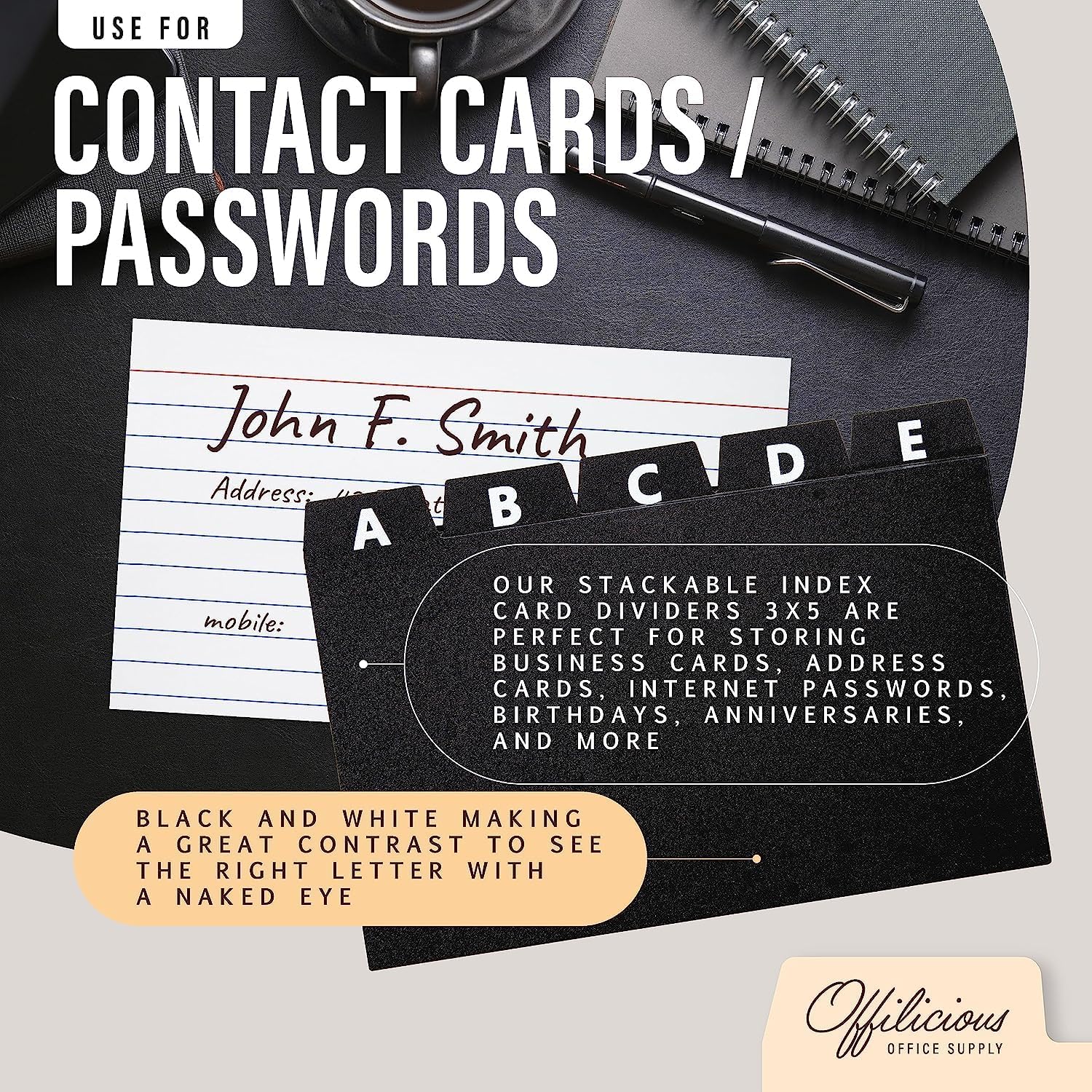 - ORGANIZE & CATEGORIZE your 4x6 index cards with precision using our OFFILICIOUS 4x6 Index Card Holder Dividers. Our dividers feature 25 Plastic Black Index Card Dividers with ALPHABET TABS, ensuring seamless access to your colored index cards 4x6 and creating a streamlined index card organizer for enhanced efficiency.