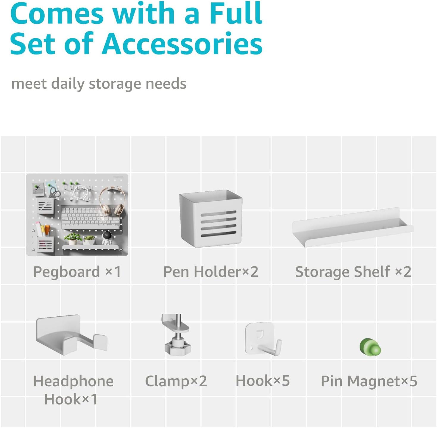 - MULTIPLE ACCESSORIES: The two sizes available allow you to choose the perfect fit for your needs, while the wide range of accessories ensures that you can personalize your organization system. Our desk organizer set includes storage shelf, pin magnets, hooks, pen holders and headphone hook.