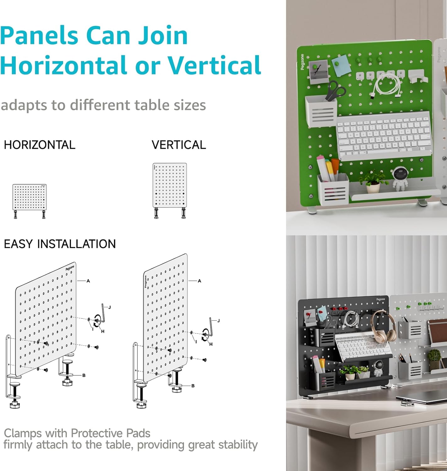 - EASY INSTALLATION: Designed with a clamp mount, this pegboard is easy to install without damaging your desk. Say goodbye to complicated assembly! This clamp-on pegboard requires only a few screws to tighten. You can install it horizontally or vertically to suit your needs.
