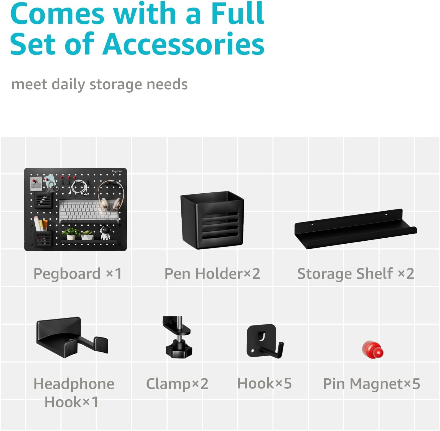 - MULTIPLE ACCESSORIES: The two sizes available allow you to choose the perfect fit for your needs, while the wide range of accessories ensures that you can personalize your organization system. Our desk organizer set includes storage shelf, pin magnets, hooks, pen holders and headphone hook.