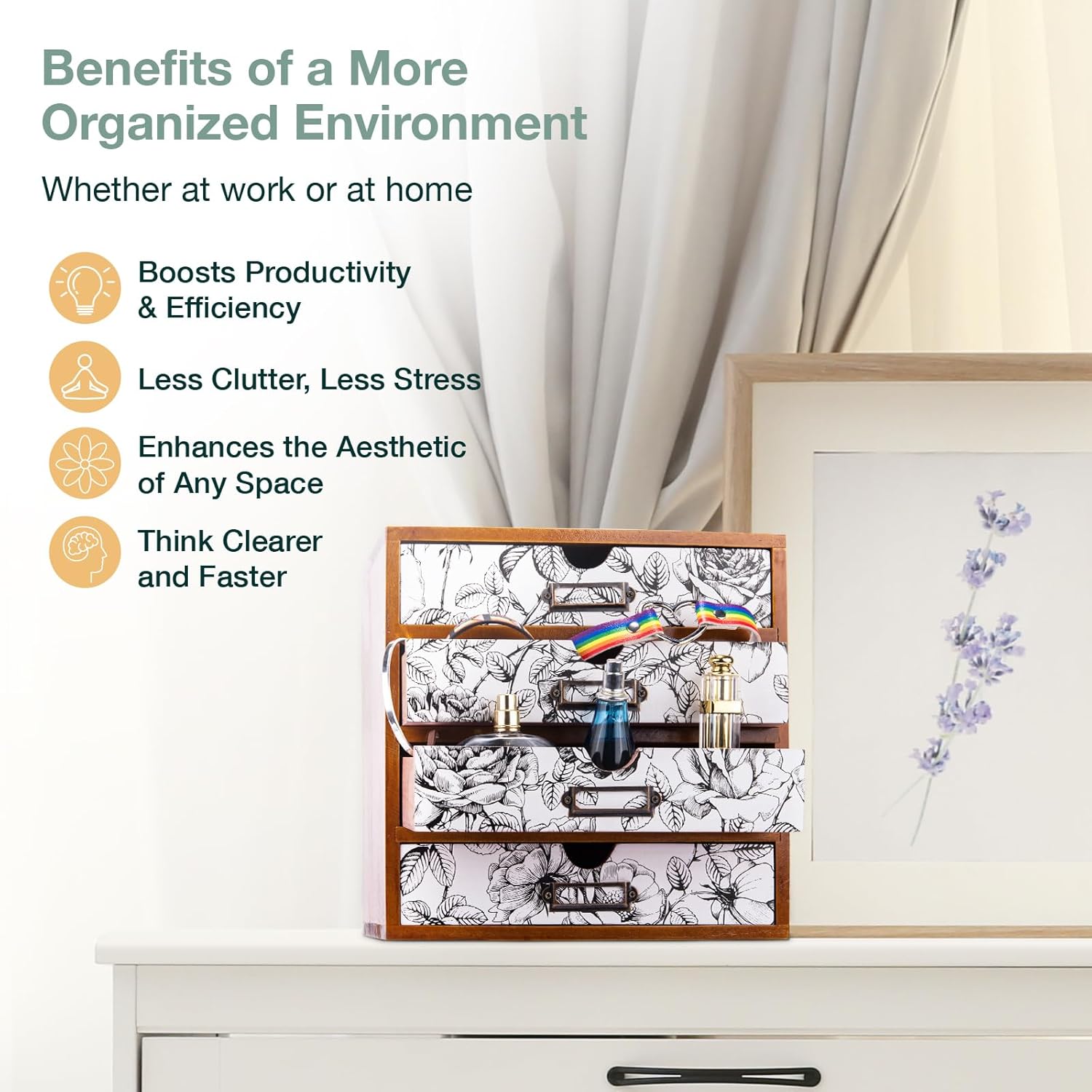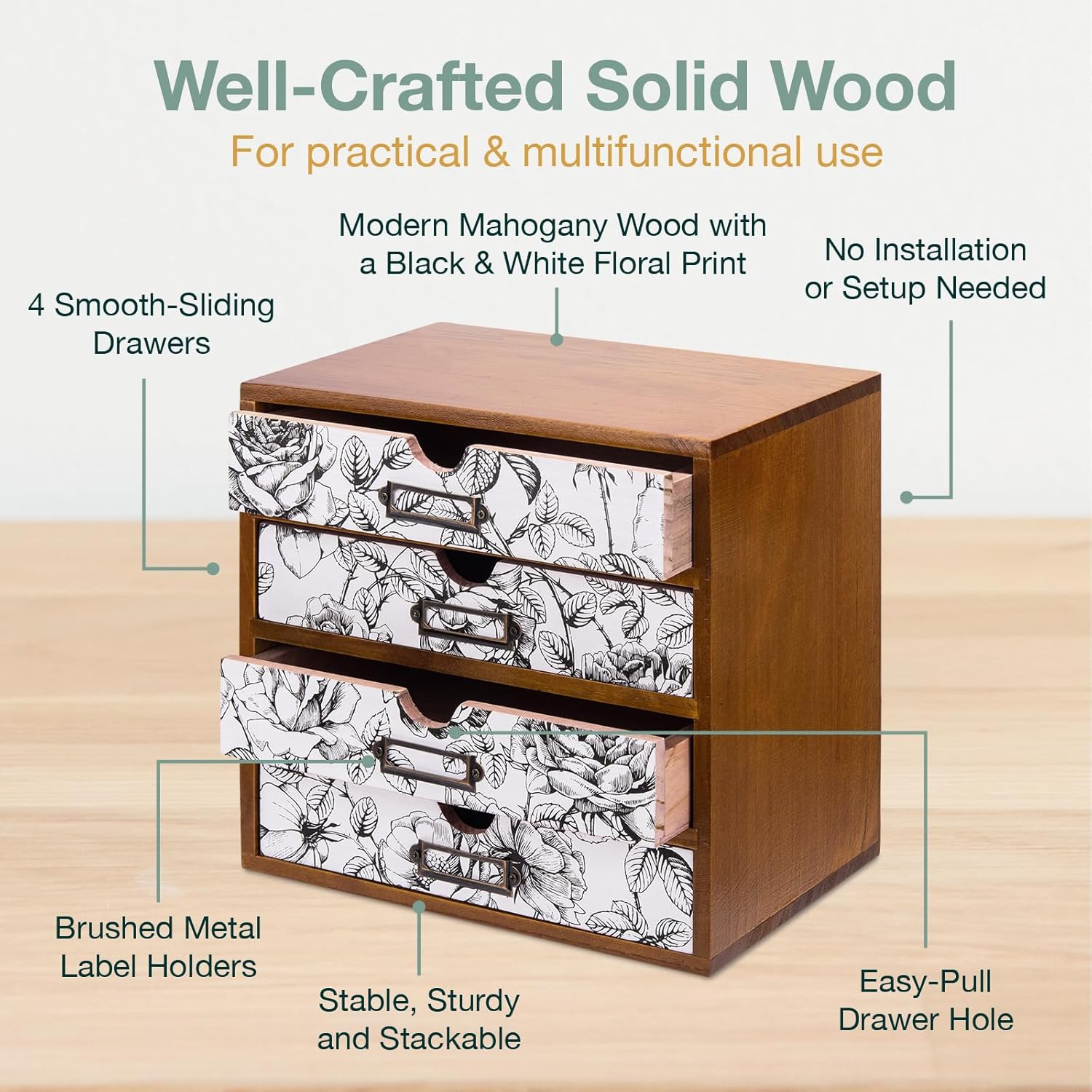 - Organizing Made Easy - Never have to open and close multiple drawers when searching for things you need with the Woodaholic Floral Tabletop Drawers. Each having its own label holders, our countertop organizer unit makes it super easy to sort and store.