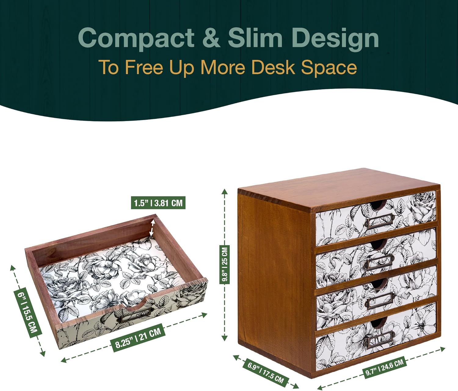 - Ideal Storage Box for Small Spaces - Specifically designed for endless uses, also know that our lovely drawer cabinet is also made to save precious desk space. Even with a compact 9.8x9.8-inch footprint, you can easily use these 4 floral drawers for your craft supplies, pens, skincare and more