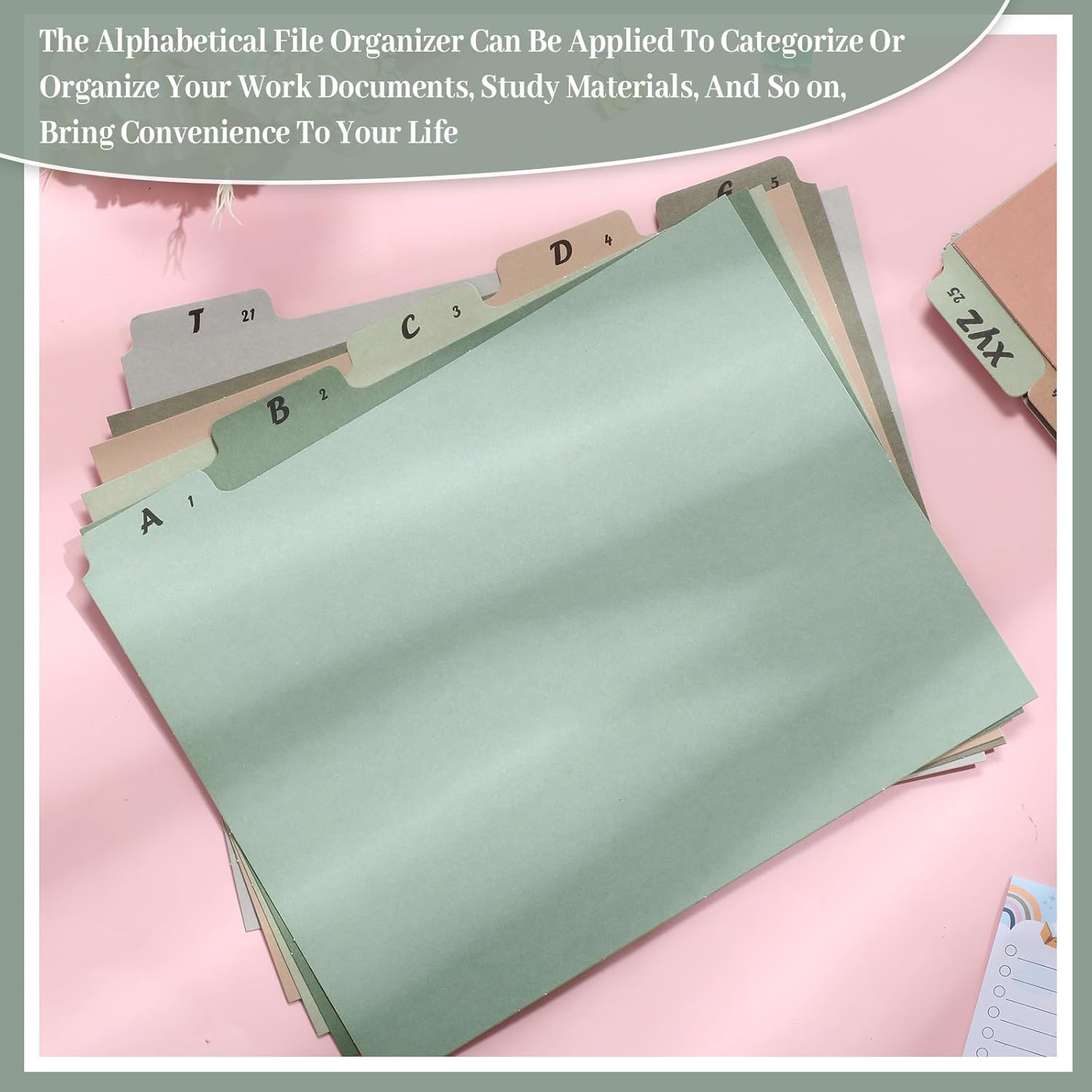 - Unique and Stylish Design: these alphabetical dividers are finished in the charming Morandi color palette, providing a stylish alternative to universal file folders; Comprising of 12 different beautiful colors, these dividers not only function to keep your files organized but also present a pleasing aesthetic value to your workspace