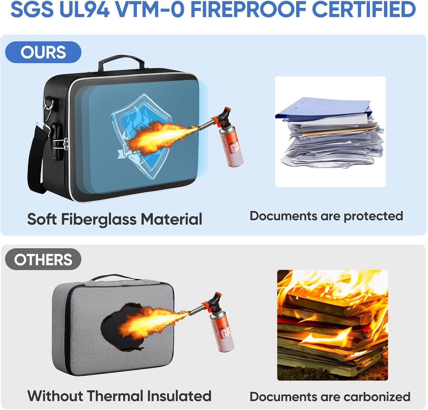 - Fireproof and Waterproof: The fireproof document box /bag is made of dust-proof silicone fiberglass, offering fire resistance up to 2192β, SGS-certified (UL94 VTM-0); Its waterproof design protects your documents from rain and spills (No folders included)