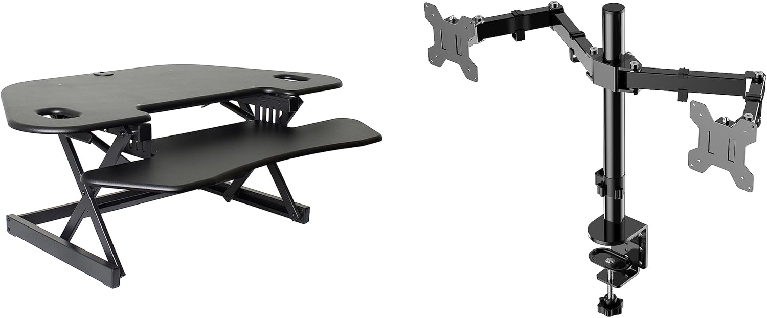 - Standing Desk Converter Bundle includes 46" corner desk riser (R CADRB-46-ACUSB) and Dual Monitor Arm (R DM2) for easy ergonomic positioning of 13"-27" flat panel monitors to optimize viewing comfort. R DM2 includes a grommet mount to install.