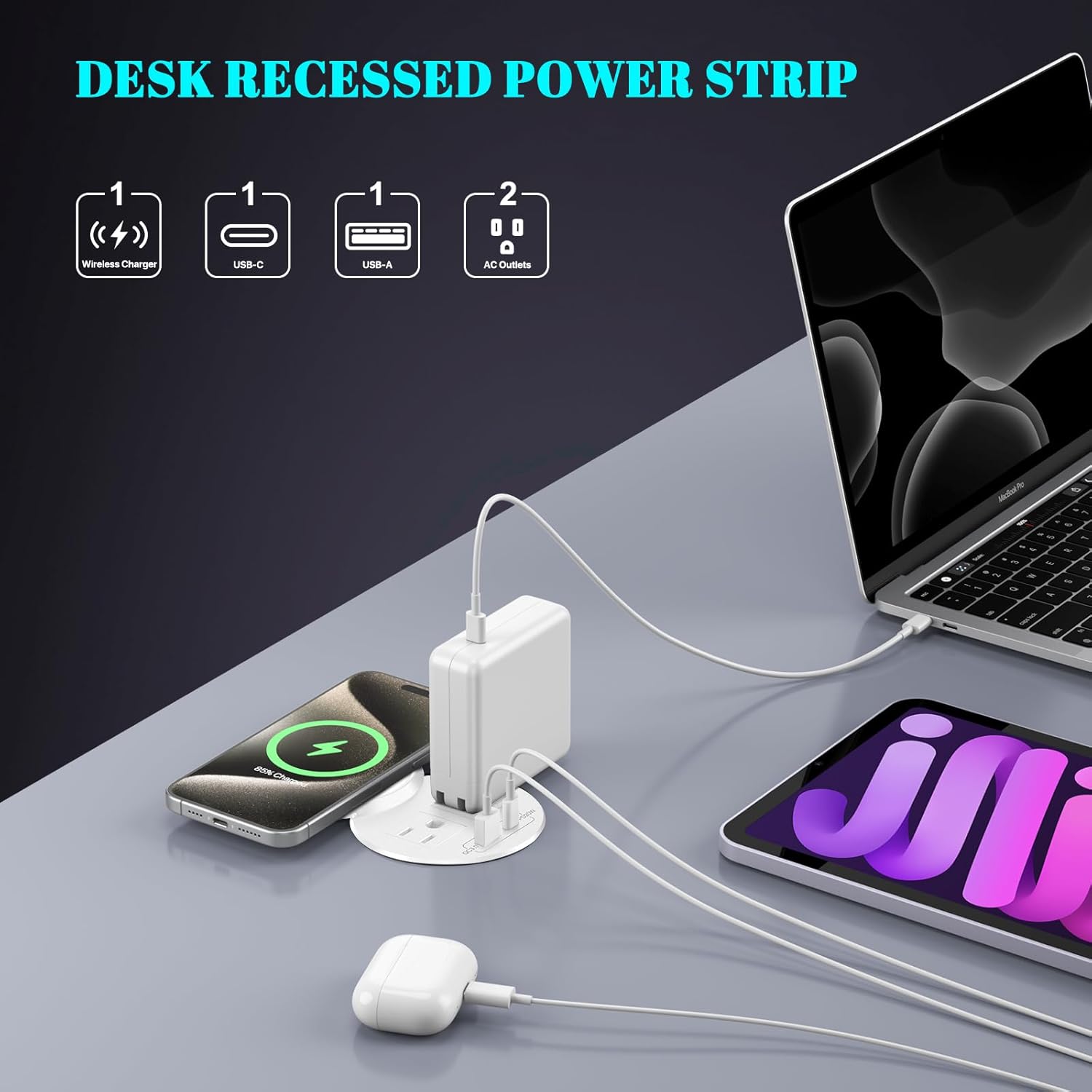 PD 20W USB C Desk Power Grommet with 15W Wireless Charger Cover, Recessed Power Strip with 18W USB A and 2 AC Outlets,Hidden Power Outlets with 6FT Cords for Office, Home, Conference(White)