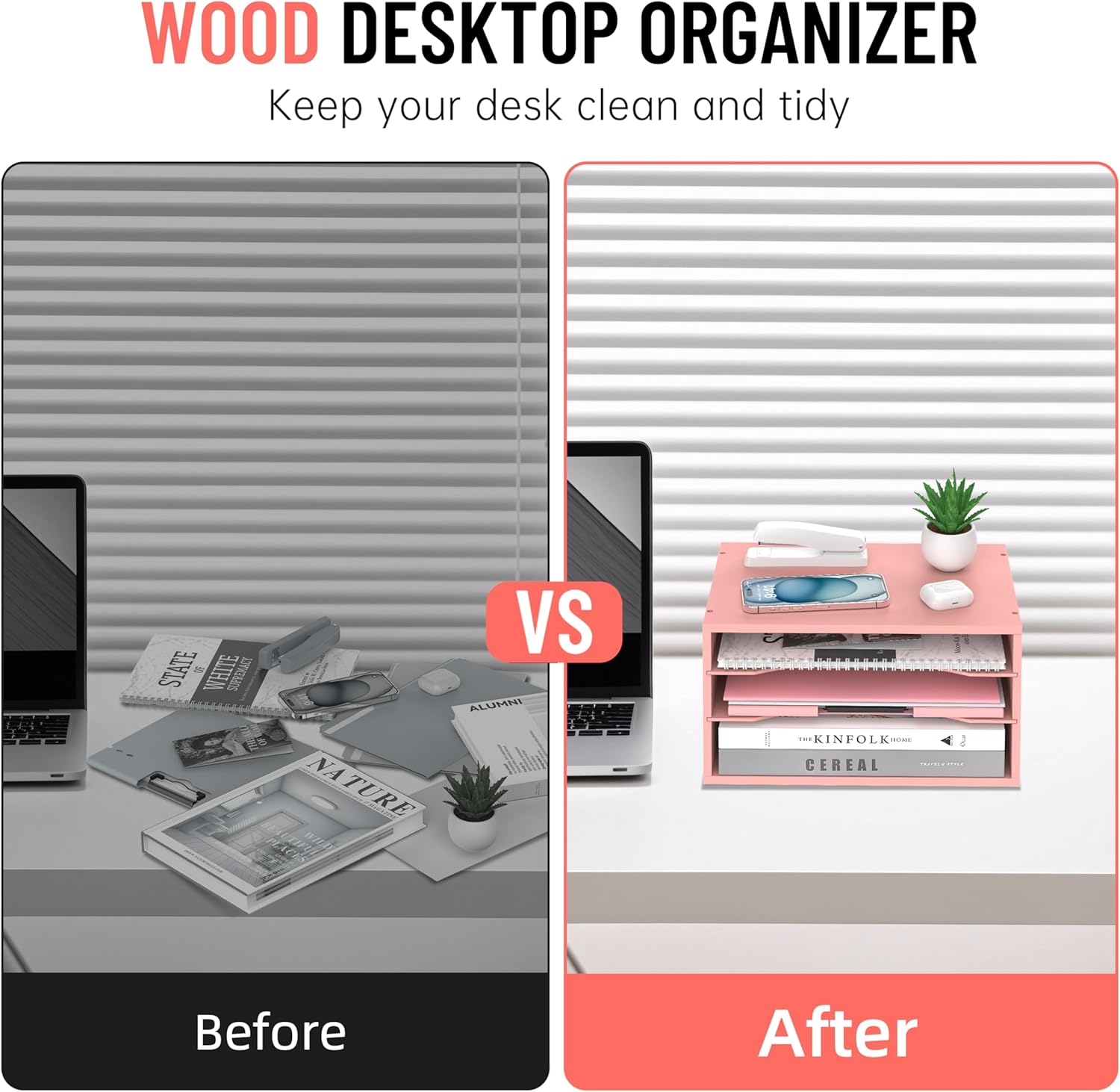 Wood Desk Organizer, 3 Tier Paper Tray Organizer for Desk with Adjustable Storage Shelves, Desktop Paper Sorter Mail Holder for Office Home Classroom, Pink