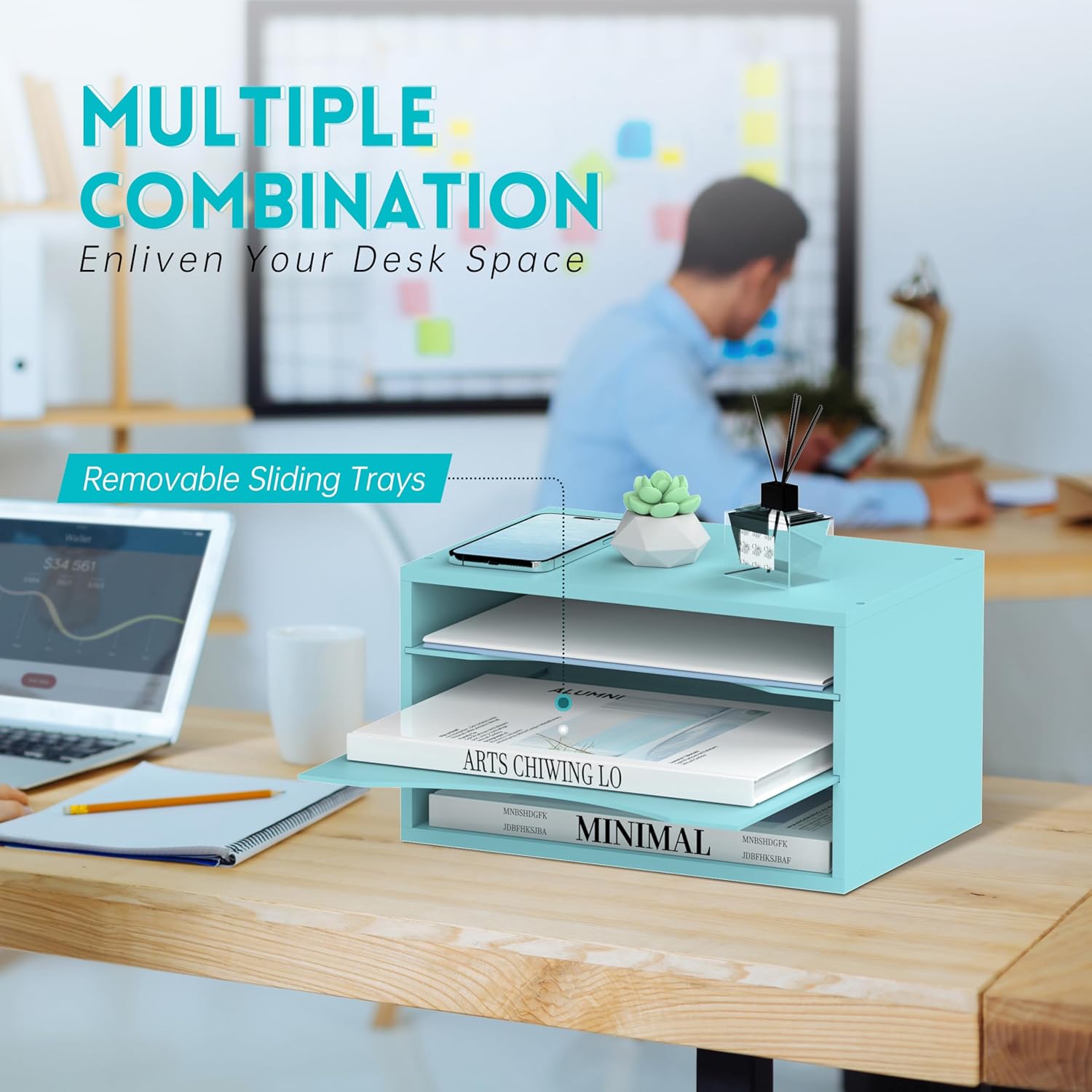 - [Flexible Desk Storage] The shelves of this wooden desk shelf for top of desk are adjustable to meet your personal needs. You can put it horizontally for standard documents, vertically as a book organizer or upright as a tub file bin. This desk file organizer is also a stackable paper tray. You can create more space by stacking this mail holder.