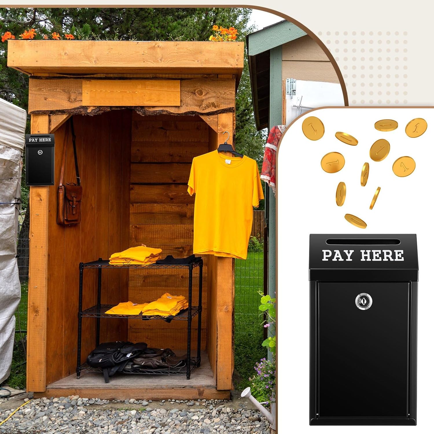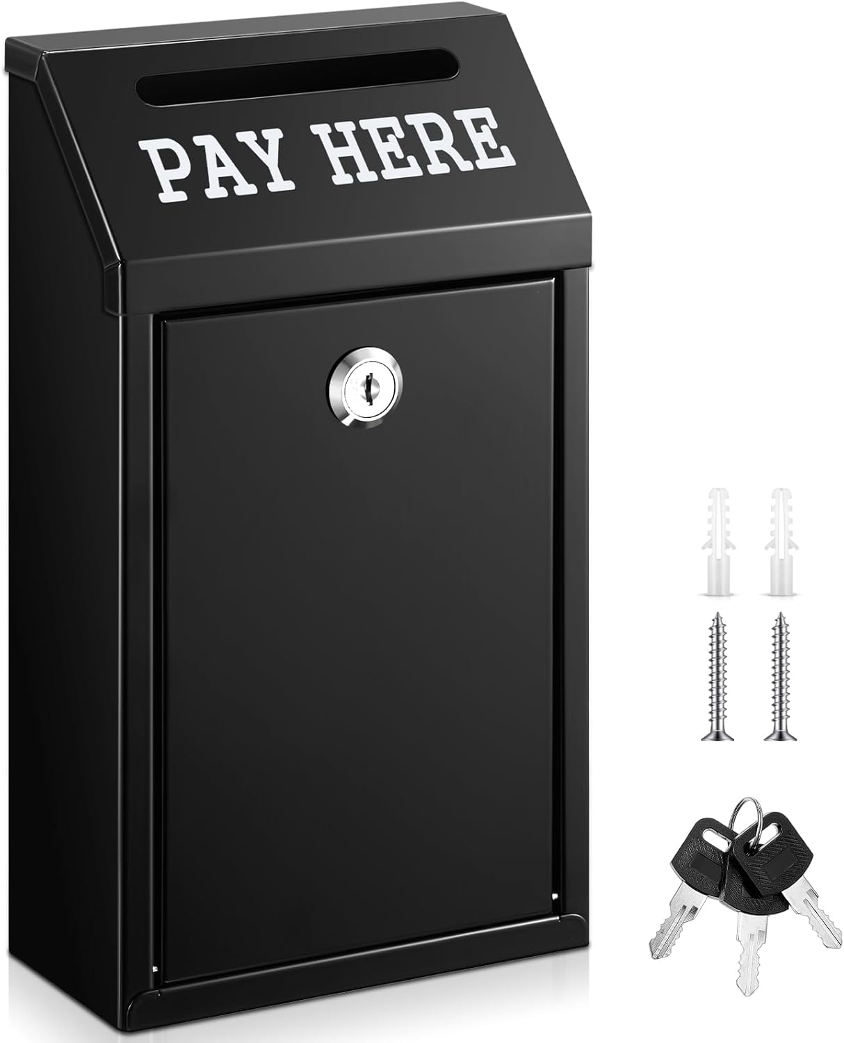 - Wide Application: with clear, rainproof text [Pay Here] printed below the drop hole, our wall safe box can be utilized outdoors in self service stalls, or indoors at shop front desks for storing change and cash among other uses