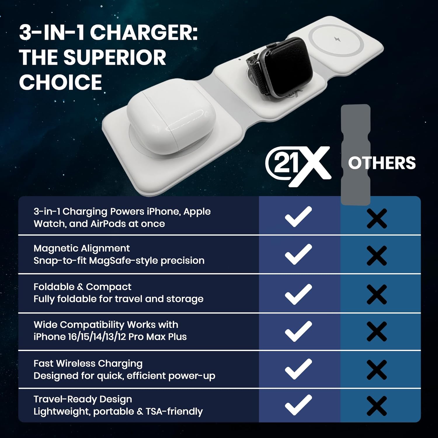 - CAMPUS-FRIENDLY 3-IN-1 CHARGING STATION – Keep your iPhone, Apple Watch, AirPods, Samsung, or Huawei devices powered in one sleek spot—no tangled cords, no outlet hunt. Fast magnetic alignment delivers efficient charging while you work, relax, or move between classes. The foldable design fits in any backpack or dorm setup, making it ideal for life on the go. With broad compatibility and a stable, slip-resistant base, it’s the clutter-free power hub every routine needs.