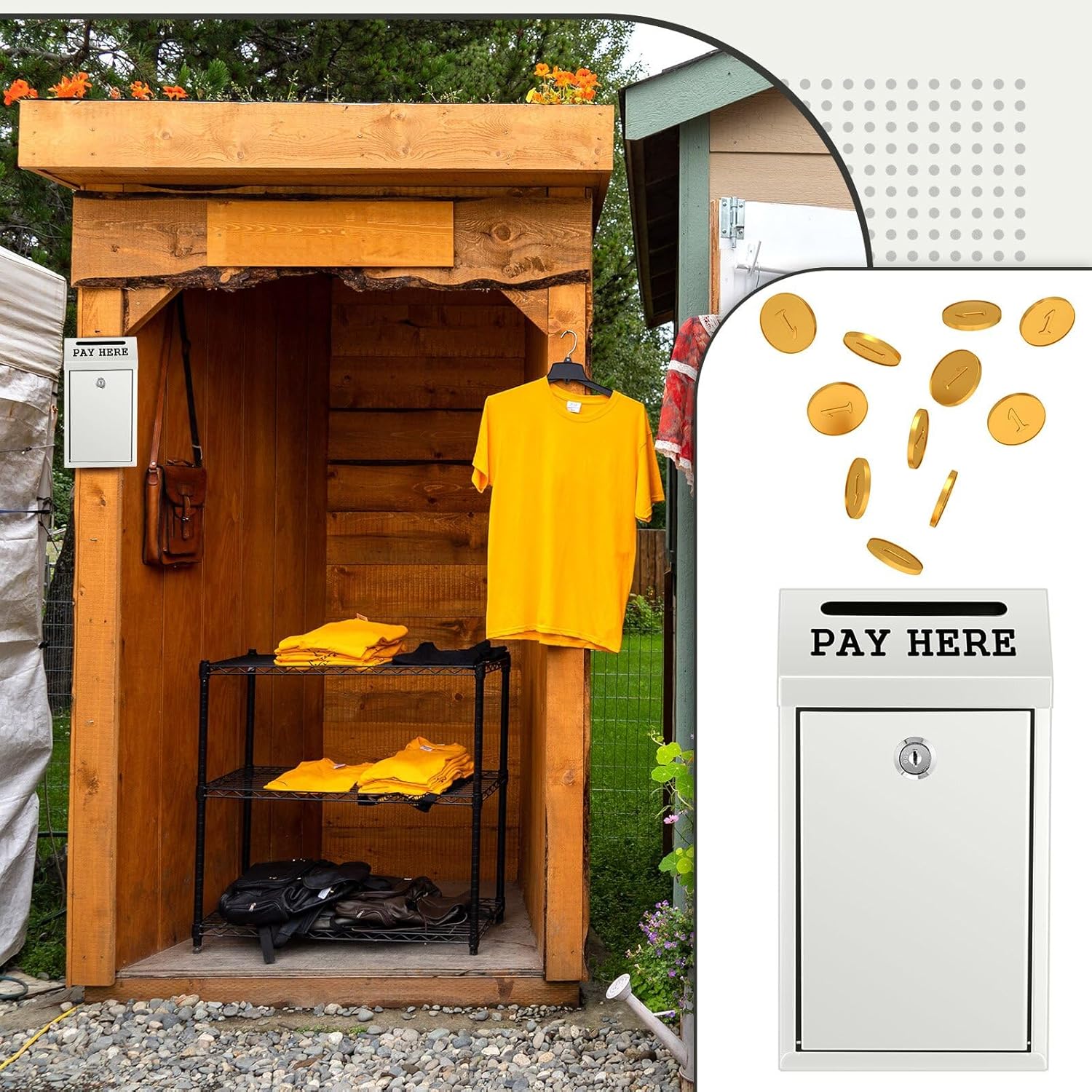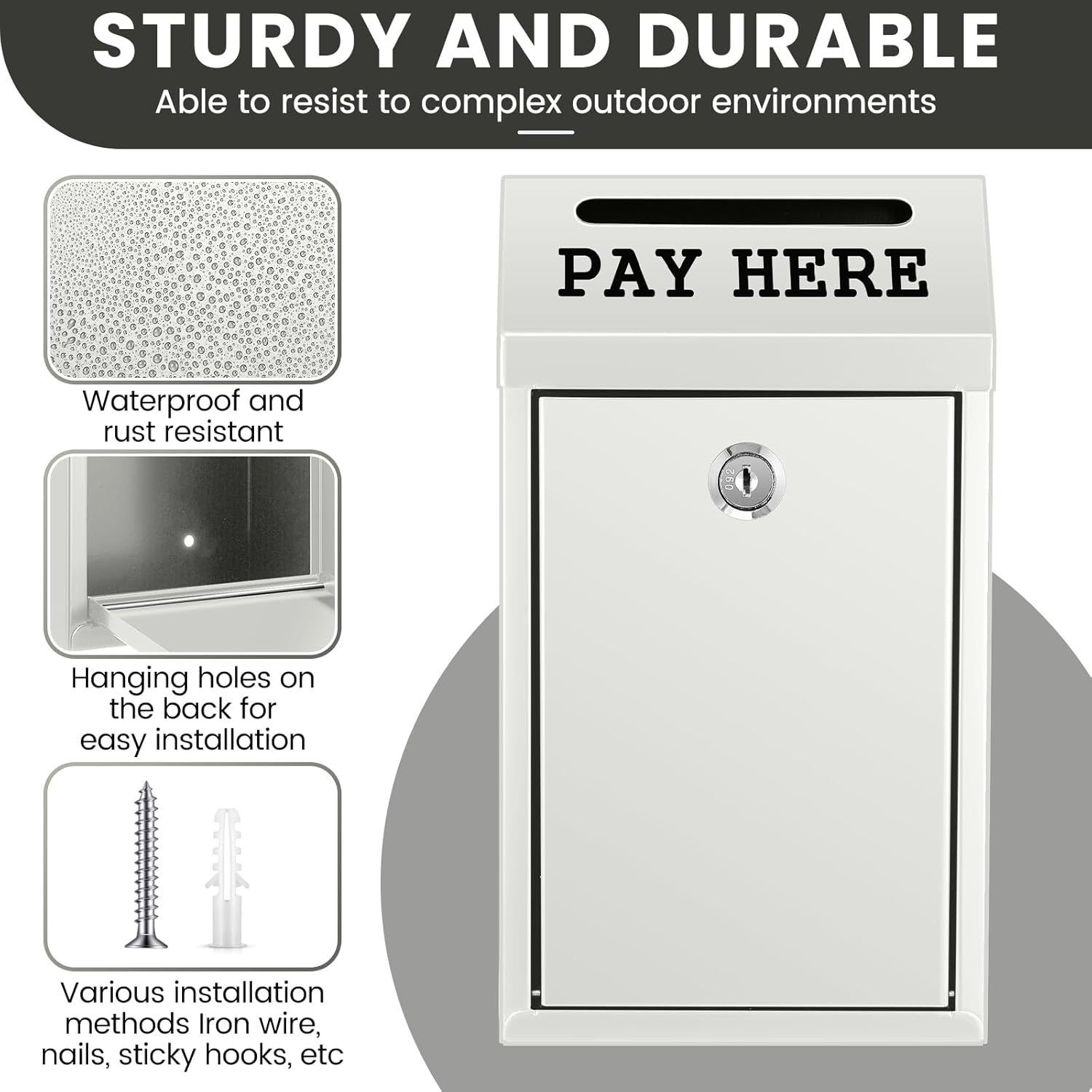 - Wide Application: with clear, rainproof text [Pay Here] printed below the drop hole, our wall safe box can be utilized outdoors in self service stalls, or indoors at shop front desks for storing change and cash among other uses