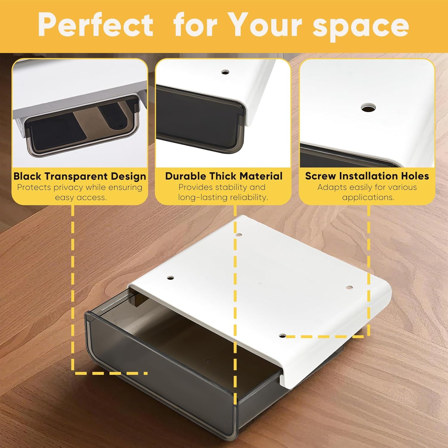 - 【MODERN & MINIMALIST DESIGN】This under desk drawer features a transparent black design that seamlessly fits into modern decor, while protecting your privacy and keeping your space stylish