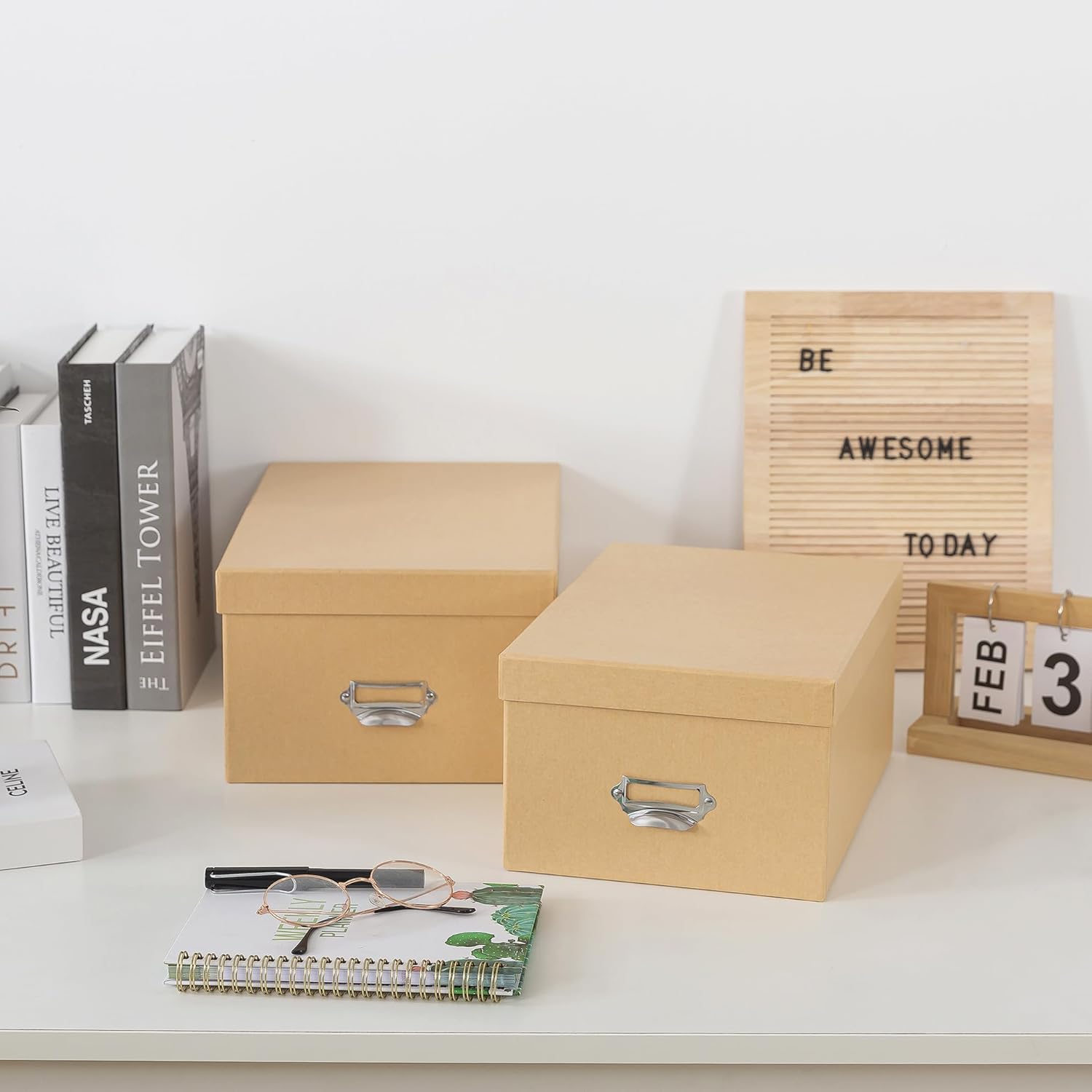 Soul & Lane Kraft Decorative Cardboard Storage Boxes with Lids, Set of 2 Stacking Keepsake Photo and Memory Boxes for Home & Office, Elegant Paperboard Organizers with Label Holders and Drawer Pulls