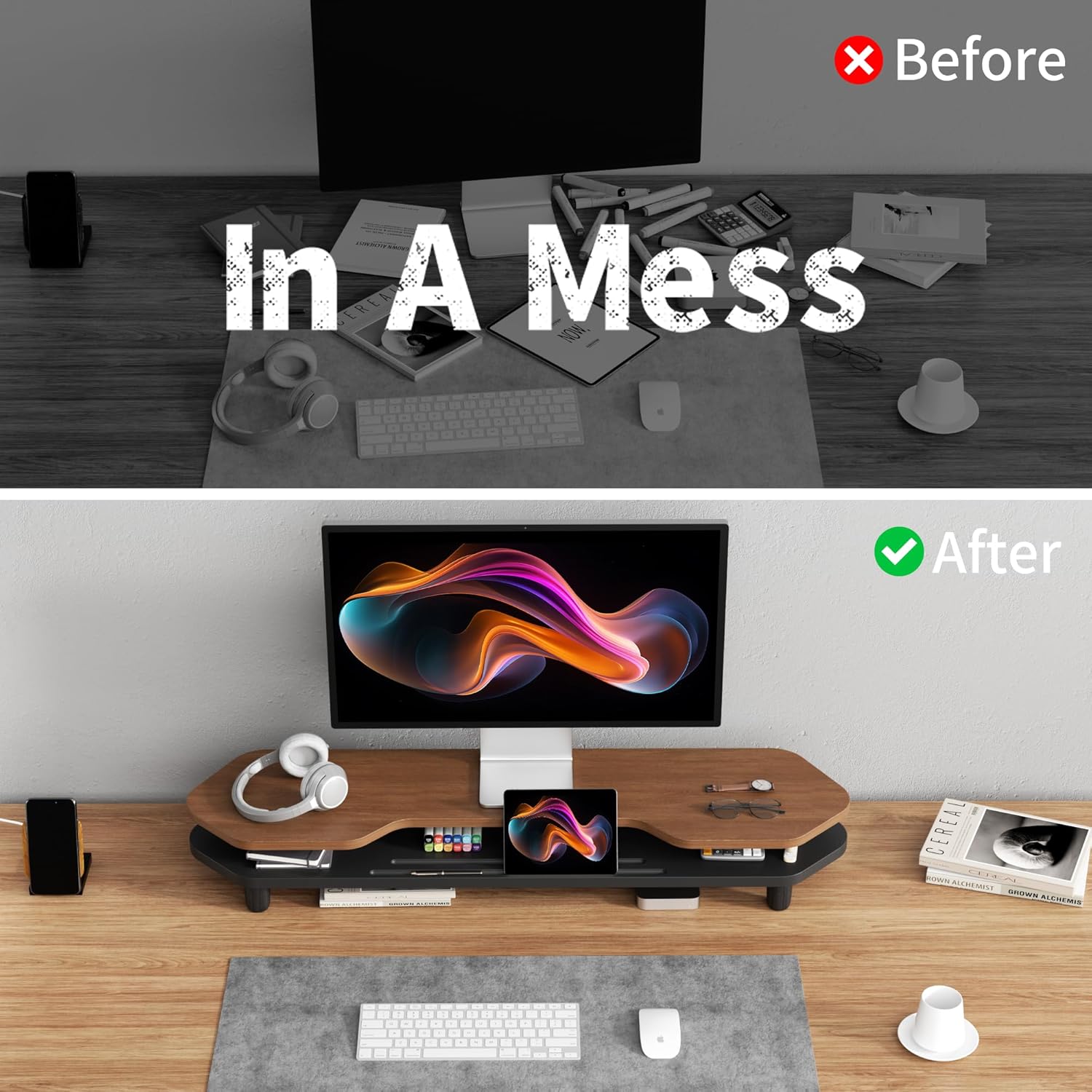 - 2-Tier Storage:This riser features a 2-Tier structure, significantly increasing the storage space compared to single-layer designs. You can put office stuff like computer monitors, keyboards, and also books, small decorations. It helps you keep your desktop clutter-free. You can place things in order and make good use of the space above the desk. This makes your working or studying area clean and efficient.