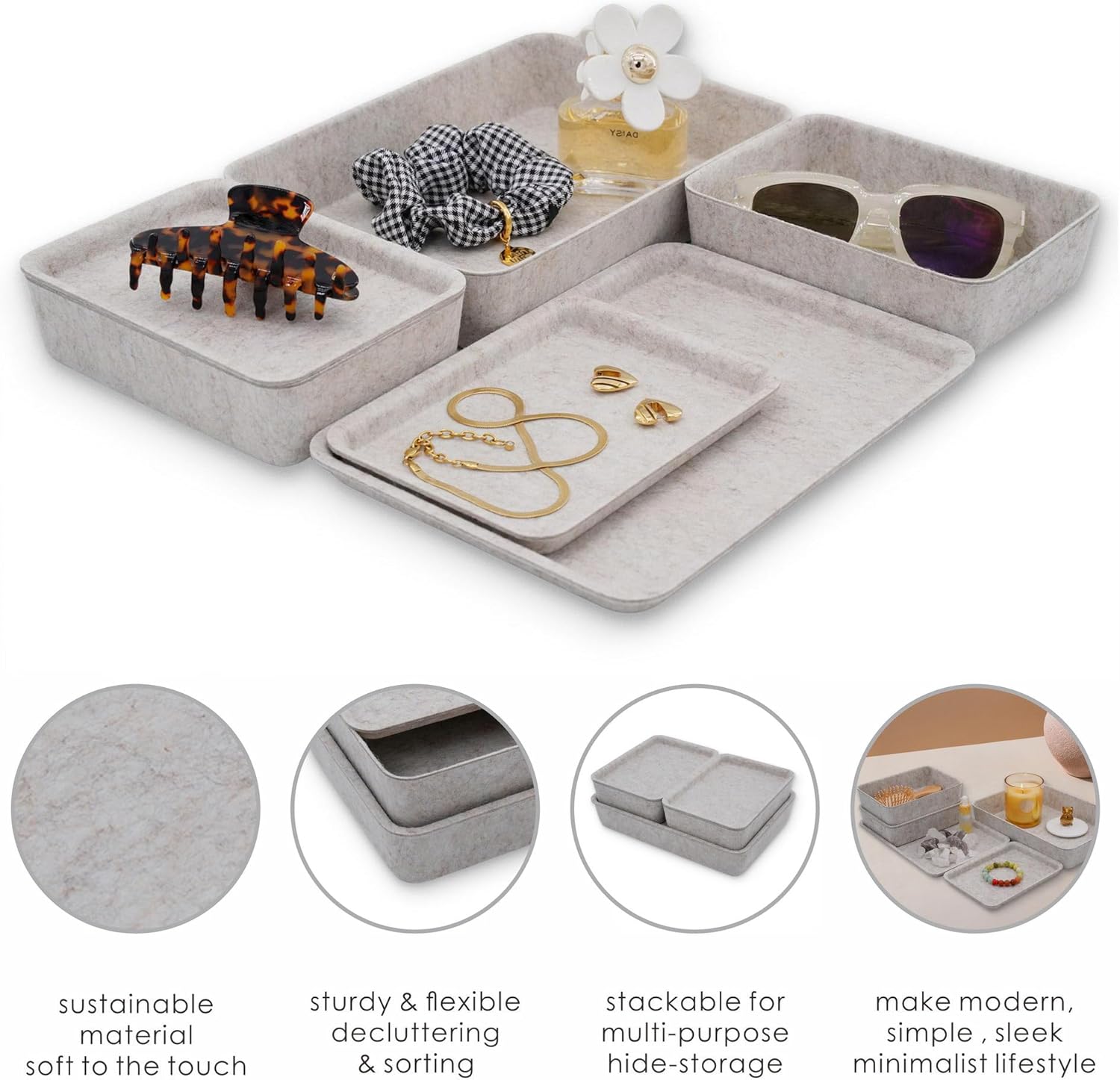 - 【Sustainable material】 recycled felt with a comfortable touch feeling. no noise like plastic keeps stuff from flying around in the drawer. The soft felt material protects your valuables from scratches while adding a touch of sophistication to any space.