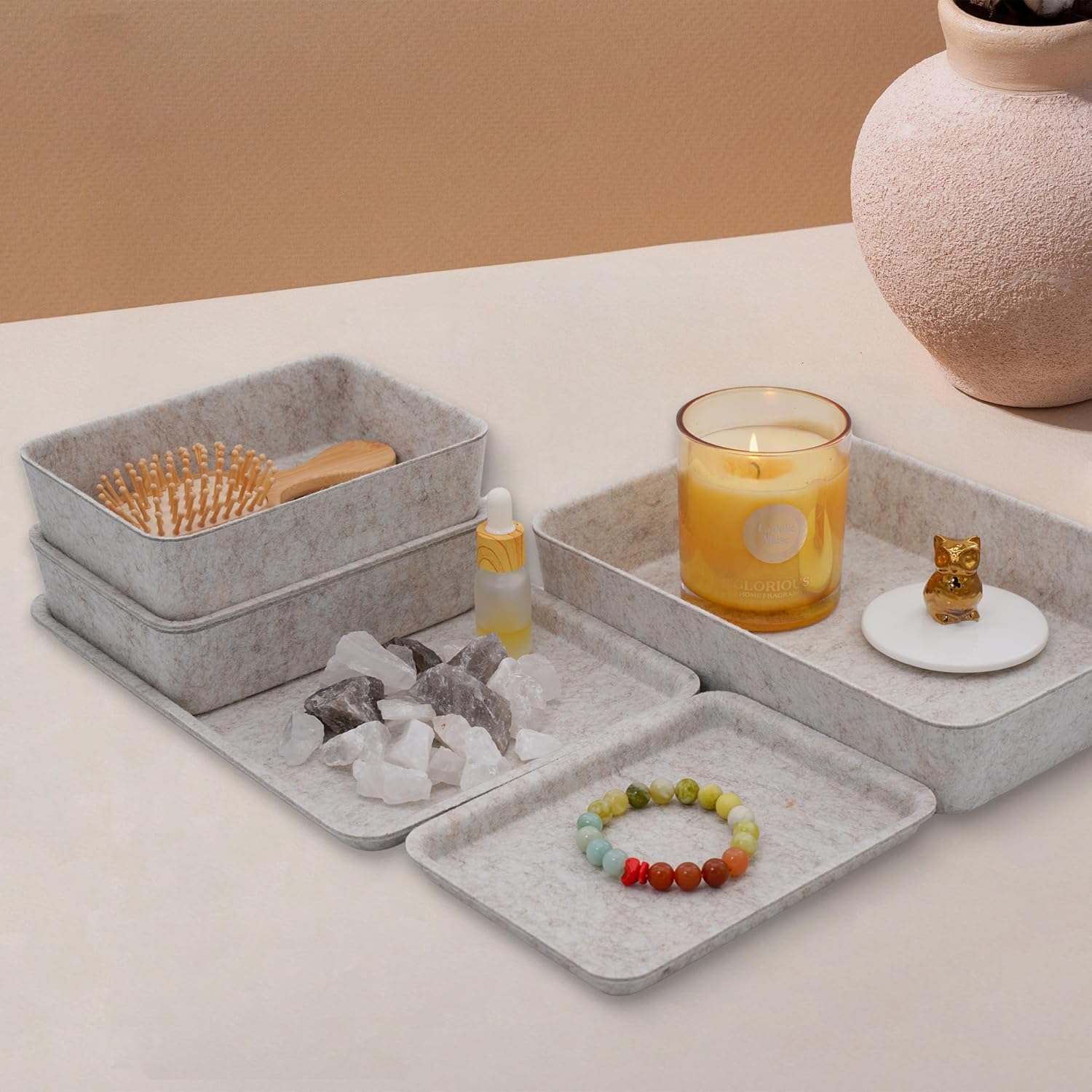 - 【Multi-purposed storage and organizer bins】Perfect for your nightstand, entryway, or desk, these versatile catchalls keep your keys, phone, wallet, watches, glasses, makeup, perfume, and small accessories neatly arranged and easily accessible. Whether you're streamlining your morning routine or decluttering your living space, these multi-purpose trays combine style and functionality for effortless organization.