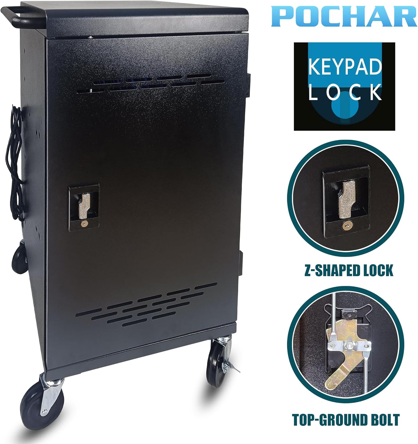- CHARGE & STORE 30 DEVICES: The POCHAR C30A-H charging cart can hold and charge up to 30 devices, including Chromebooks, laptops, and tablets up to 14 inches in screen size and 1 inch in thickness.