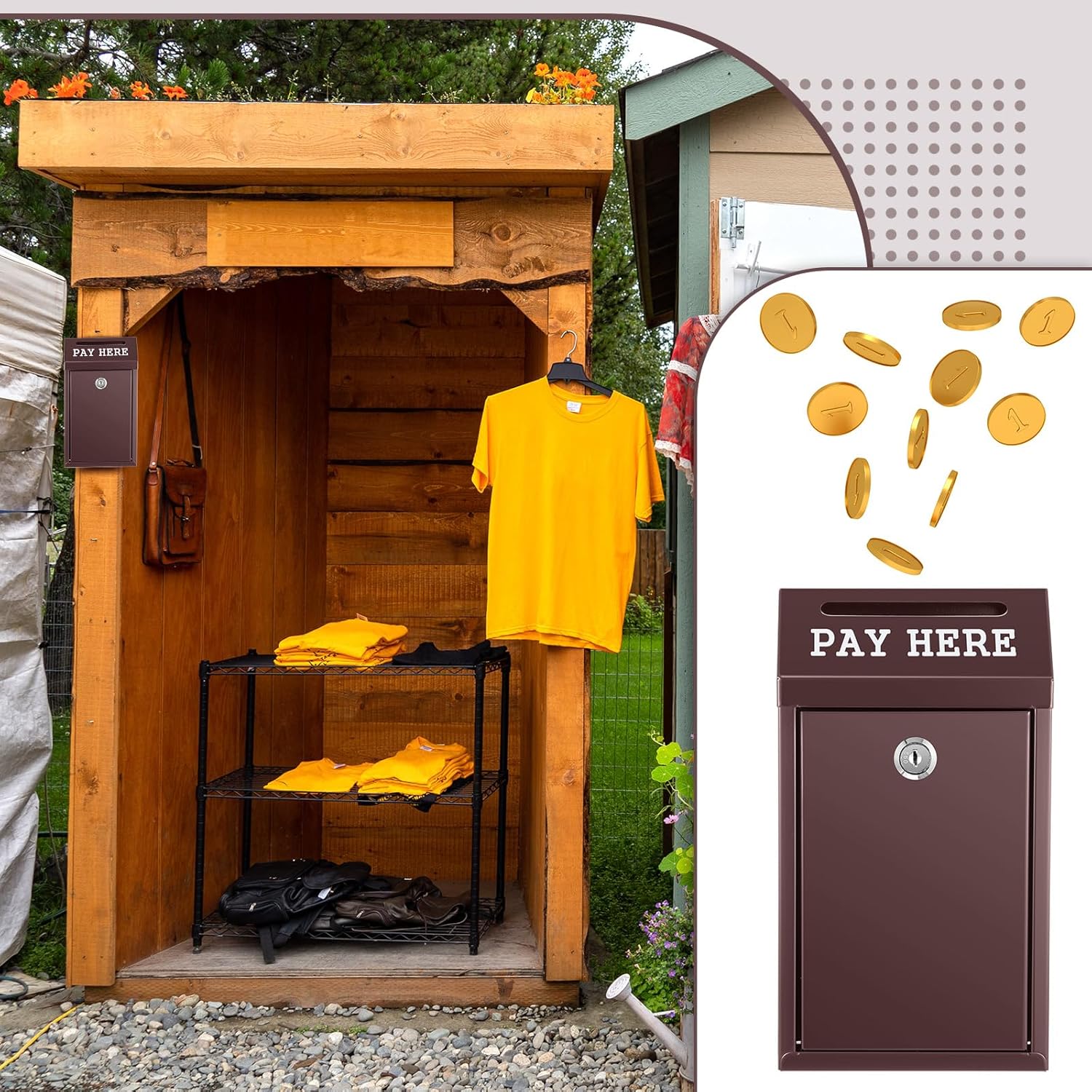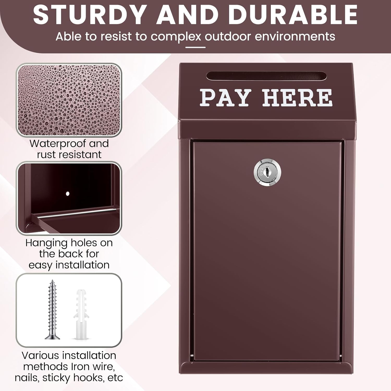 - Wide Application: with clear, rainproof text [Pay Here] printed below the drop hole, our wall safe box can be utilized outdoors in self service stalls, or indoors at shop front desks for storing change and cash among other uses
