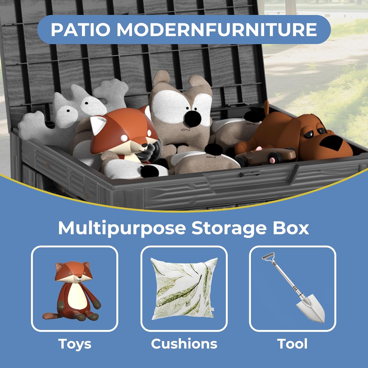 - Versatile Storage with Large Capacity Our deck box offers an impressive storage capacity, perfect for organizing patio cushions, gardening tools, pool accessories, and more. This multipurpose storage solution not only helps keep your outdoor space tidy but also functions as a bench or table. Whether in your backyard, by the pool, or on the patio, this deck box is designed to meet your every need.