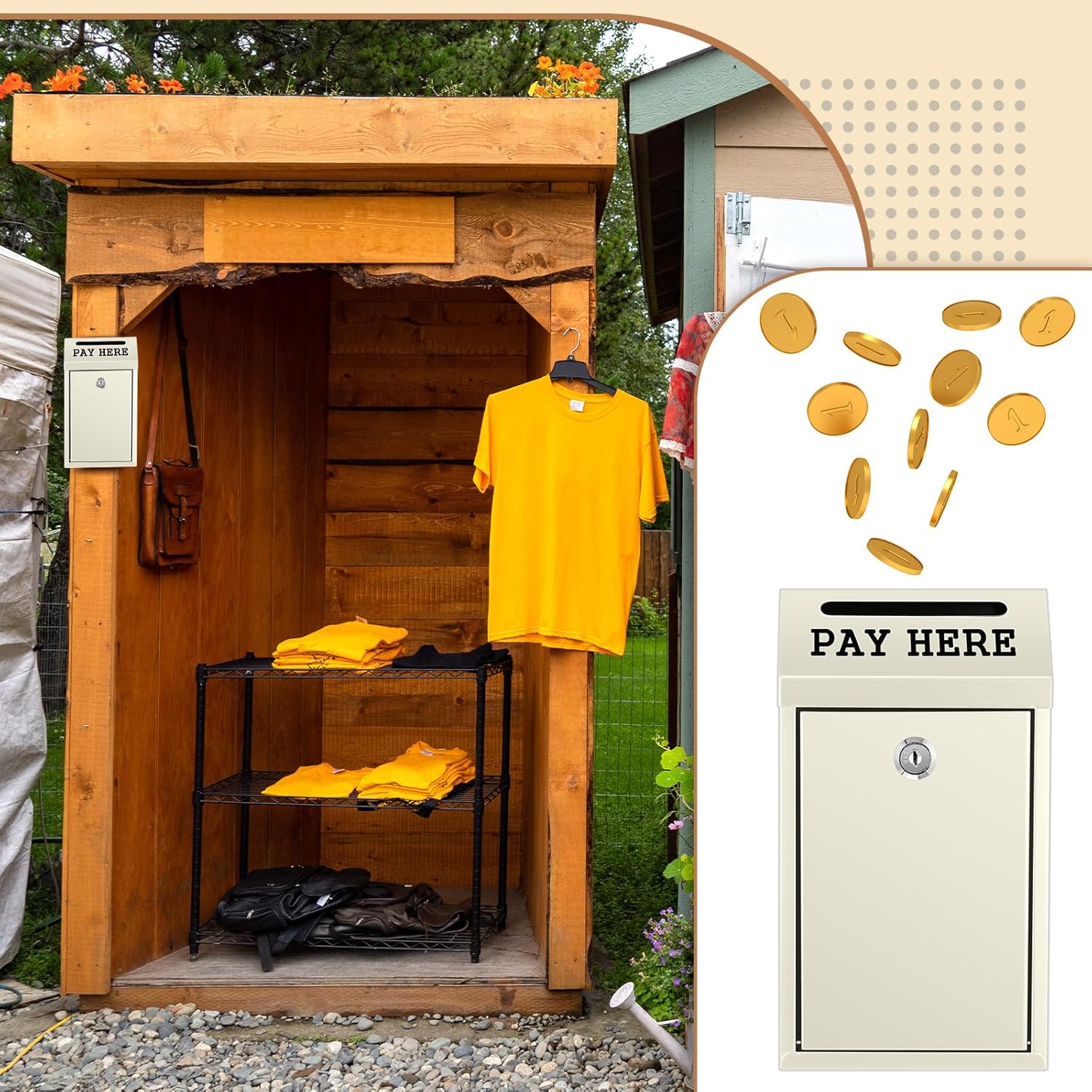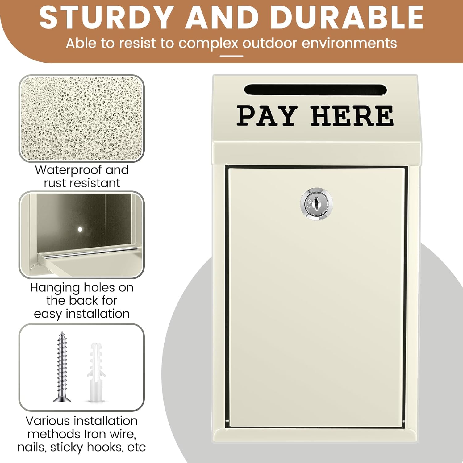 - Wide Application: with clear, rainproof text [Pay Here] printed below the drop hole, our wall safe box can be utilized outdoors in self service stalls, or indoors at shop front desks for storing change and cash among other uses