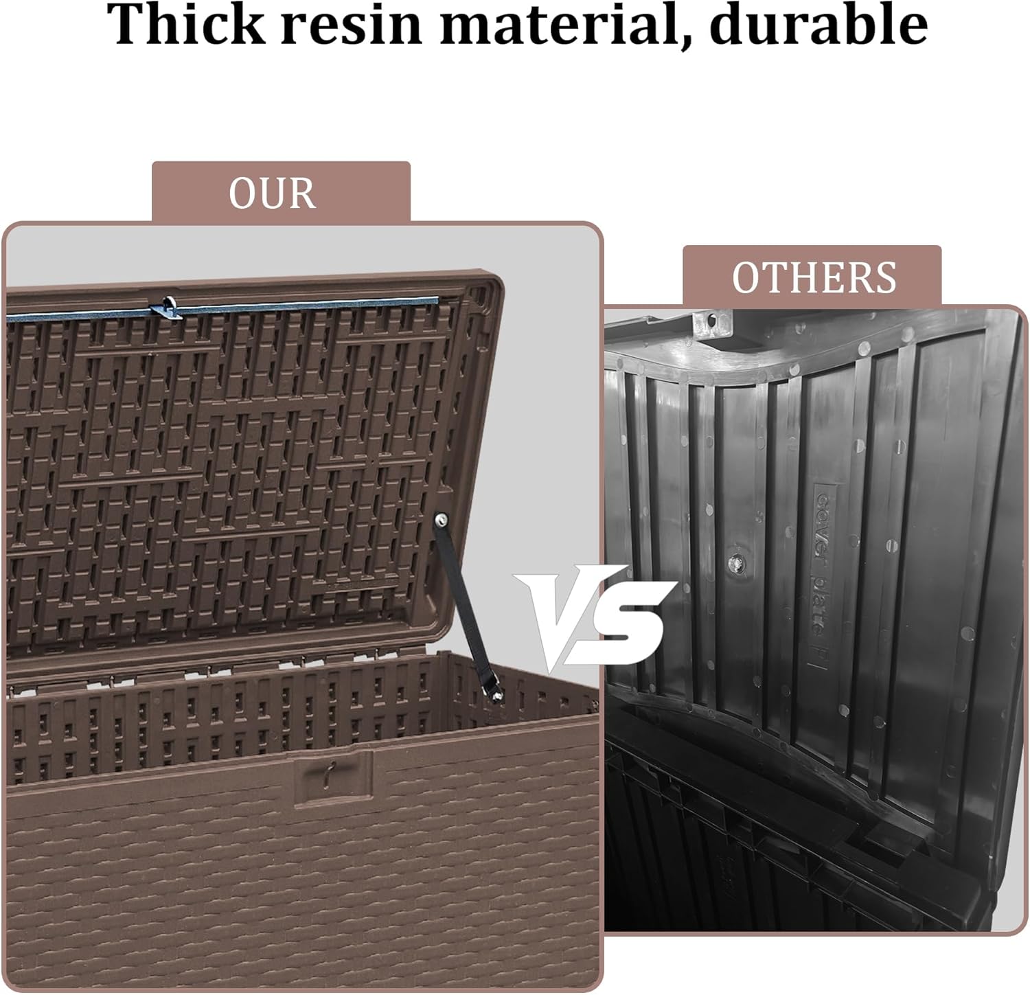 - All-Weather Durability Built to withstand any weather, our deck box is made from resin that offers waterproof, UV-resistant, and corrosion-resistant protection. No matter the season—be it scorching sun or heavy rain—this box will keep your items dry and its exterior looking as good as new.