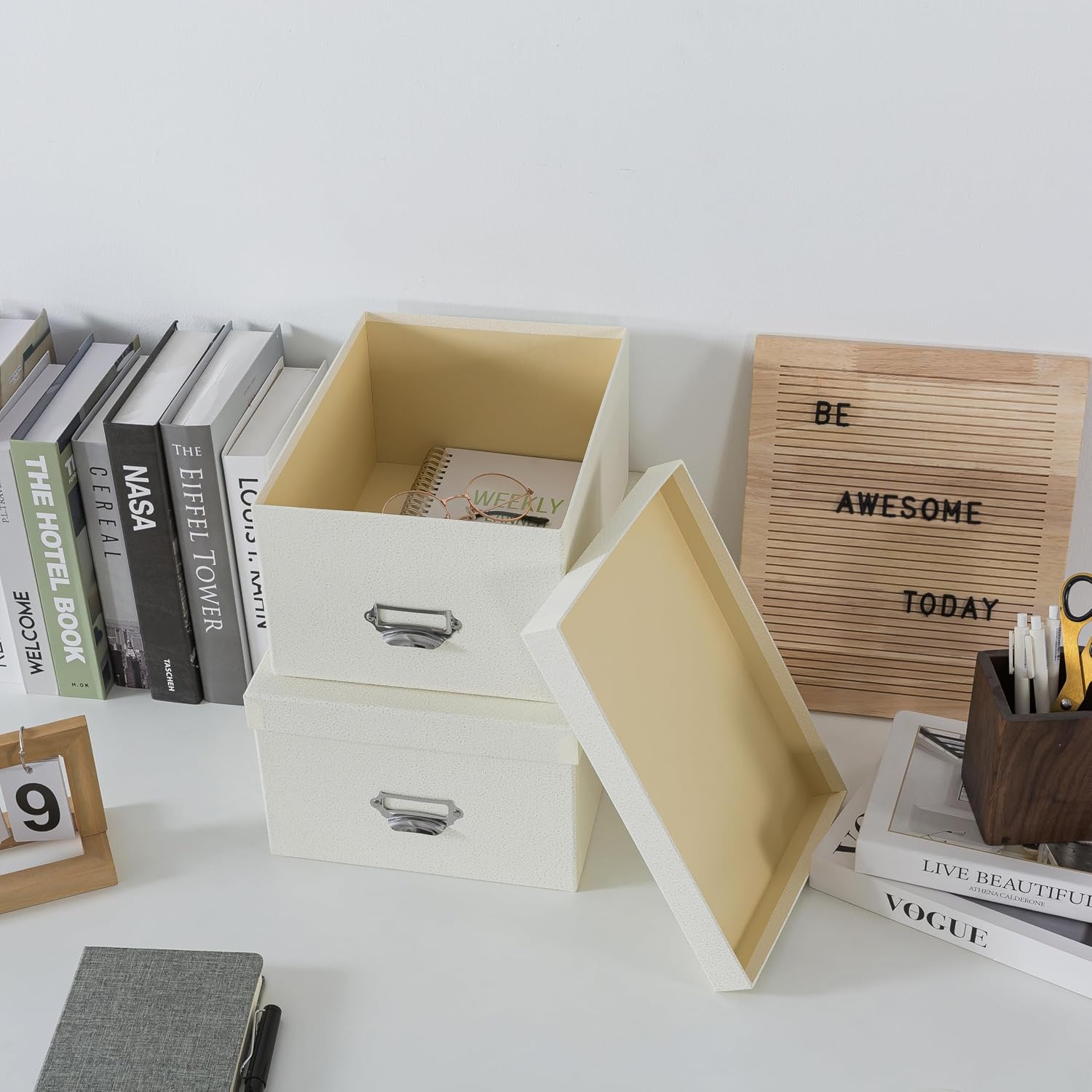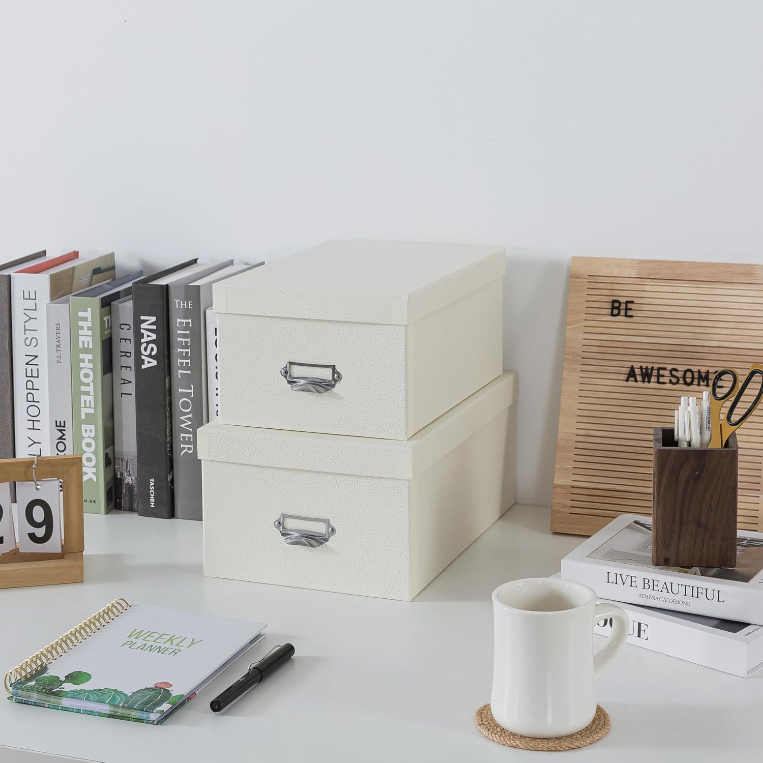 - PREMIUM KEEPSAKE STORAGE BOX: Each decorative storage box is crafted from durable paperboard with a textured finish. The subtle cream color complements any décor while the metal hardware adds vintage charm to these keepsake box organizers.