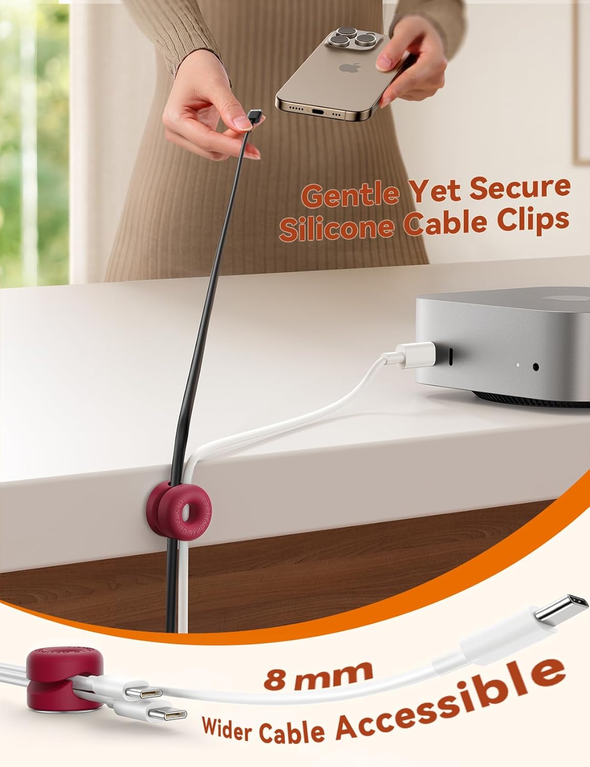 - Compact Enough to Conquer Narrow Space: Designed for confined spaces, the JOYROOM mini wire hider keeps cables neat on glossy countertops, cluttered computer desks, and vertical monitor mounts. JOYROOM cord holder always provides smooth cable management and organization wherever needed. Turn tight corners into tidy hubs—neatly arranged wires stay easily accessible thanks to the precise 8 mm diameter cable slot